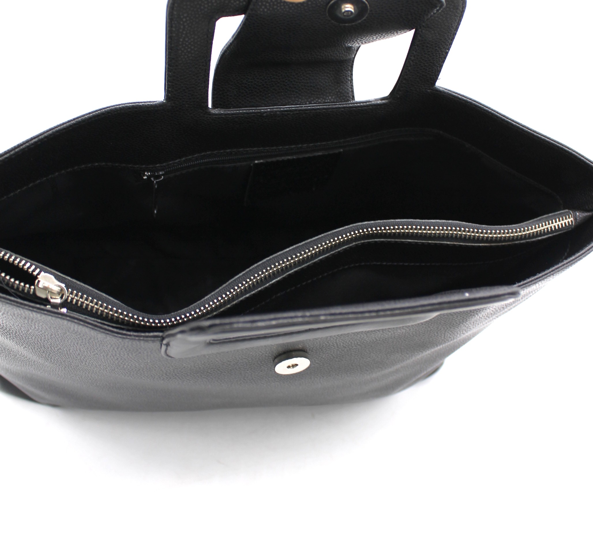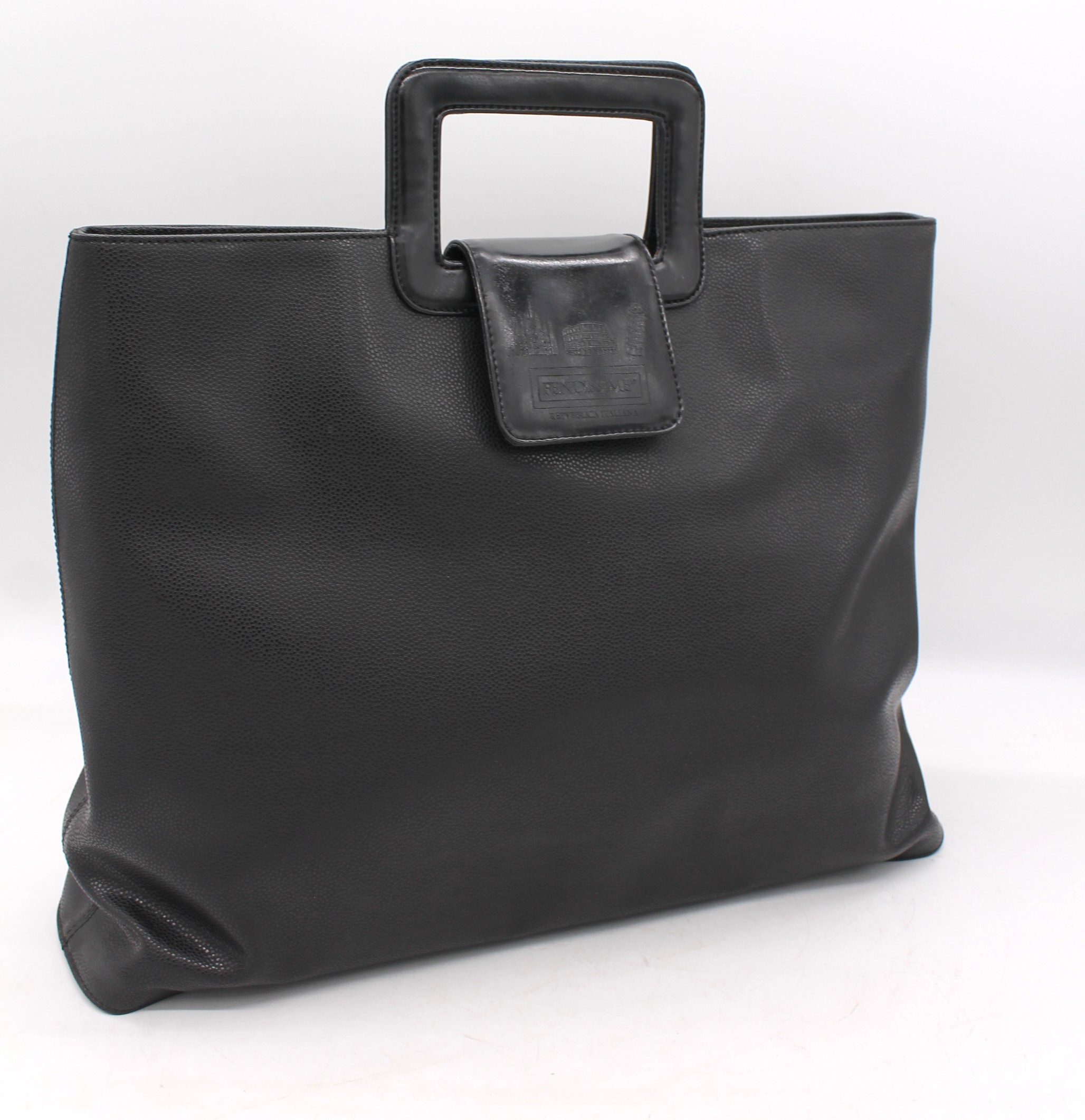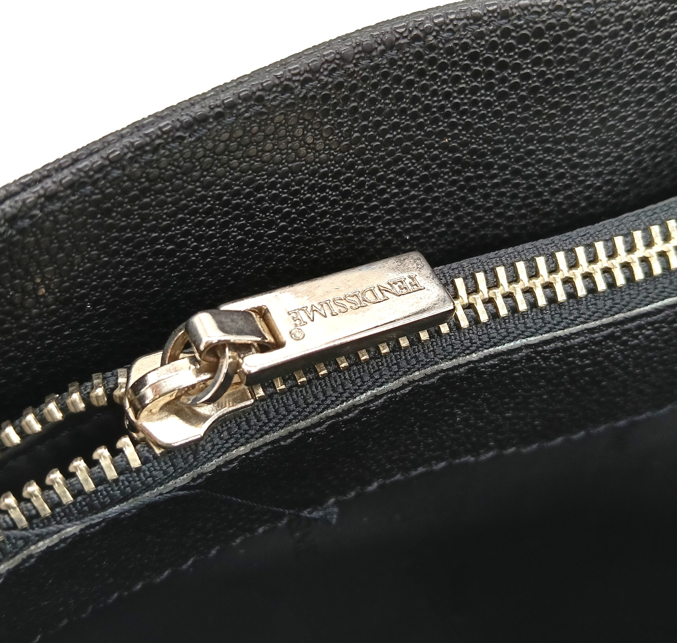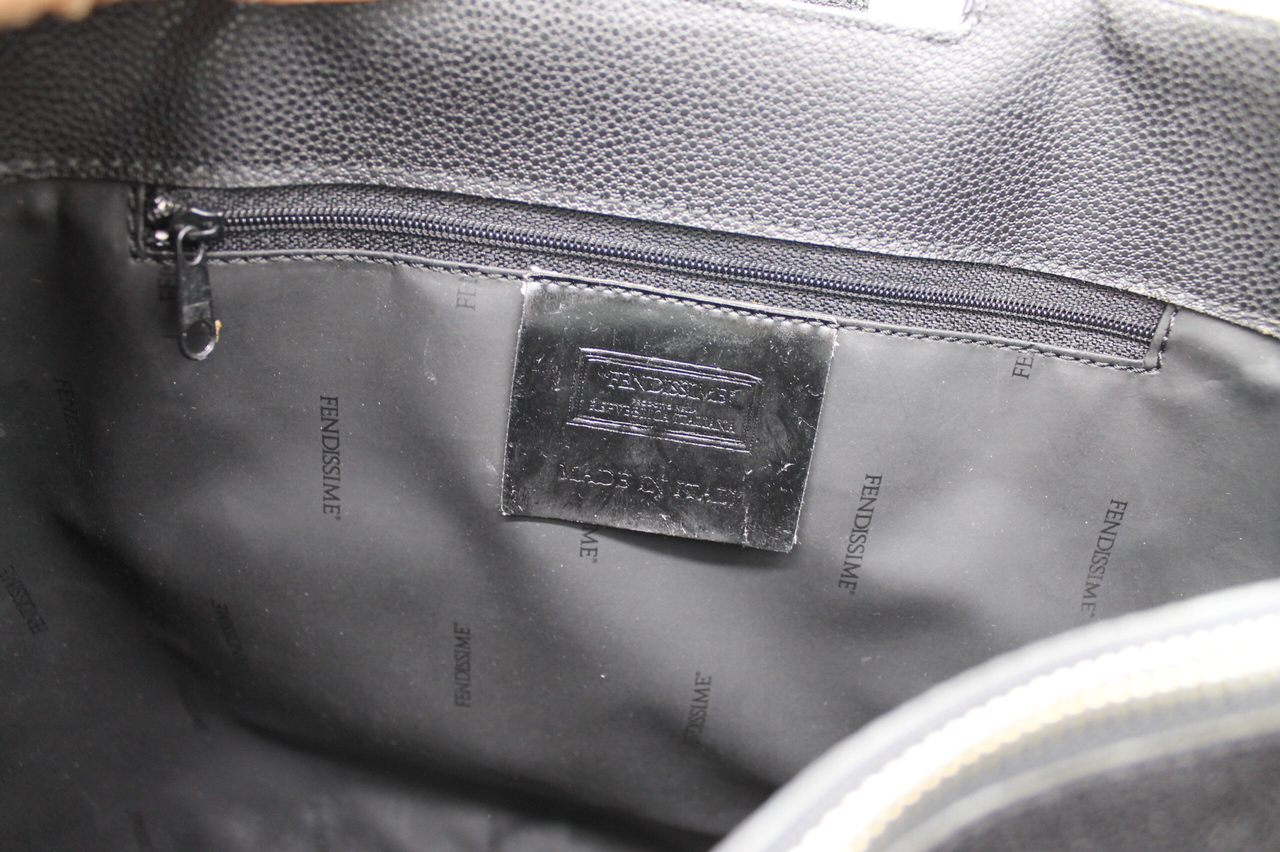 Borsa Fendissime nera, chiusura a clip, con tasca interna a zip e vari scompartimenti. Con manici.