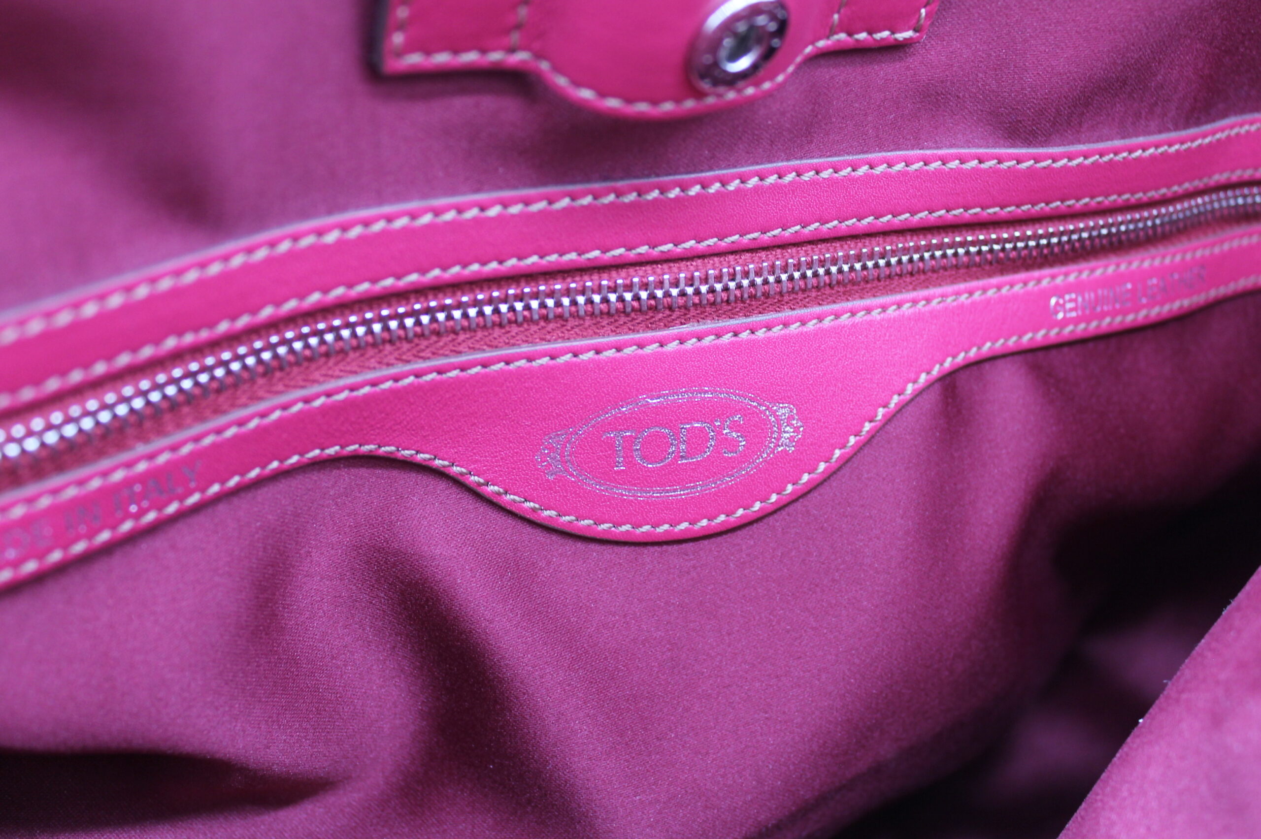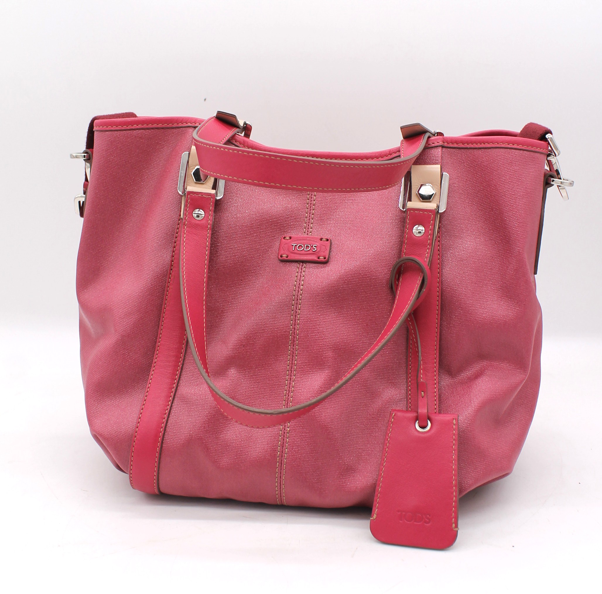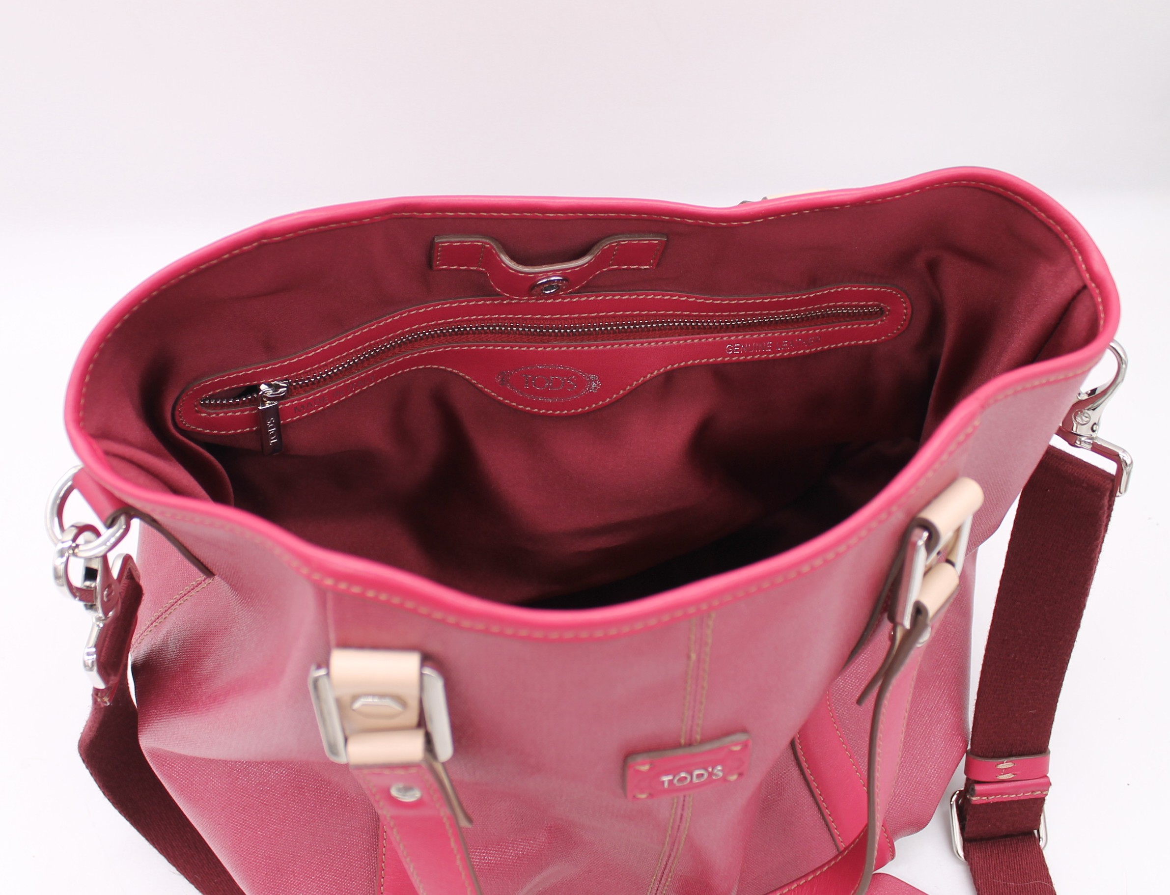 Borsa Tods originale, morbida di colore rosa fucsia. Con manici e tracolla. Chiusura a clip.