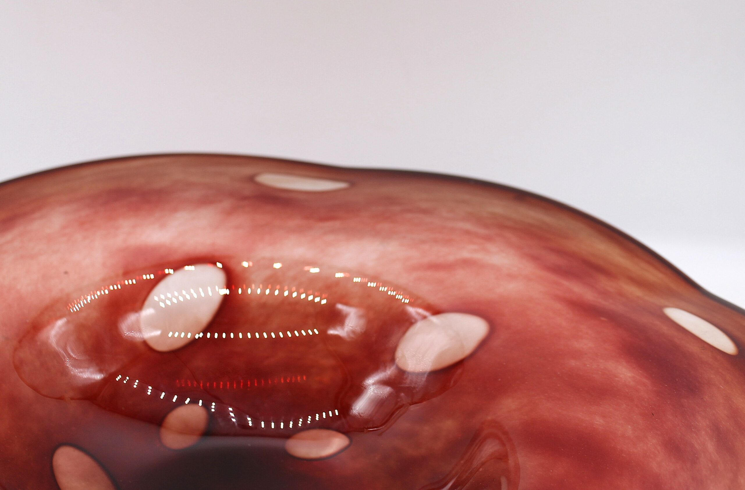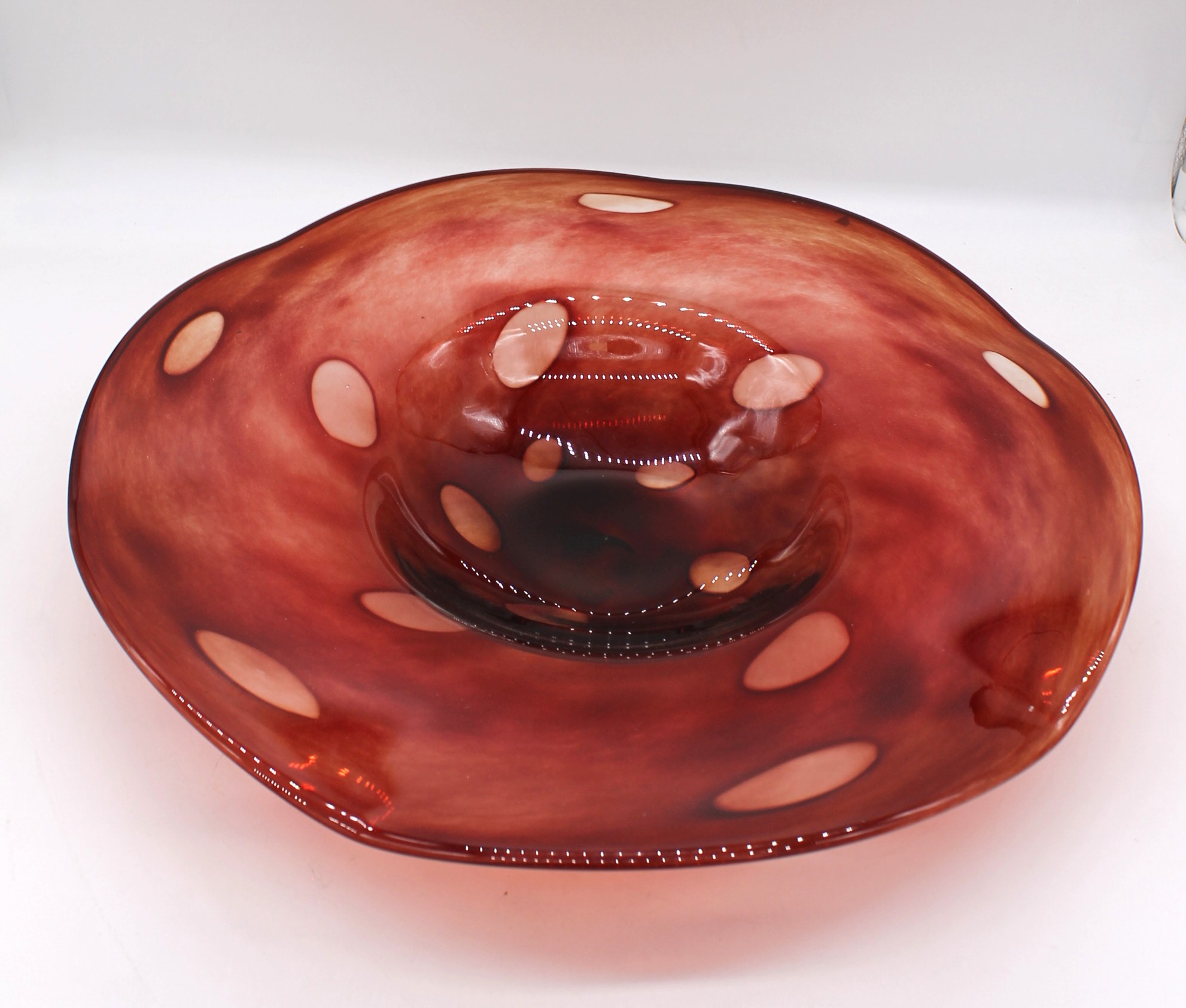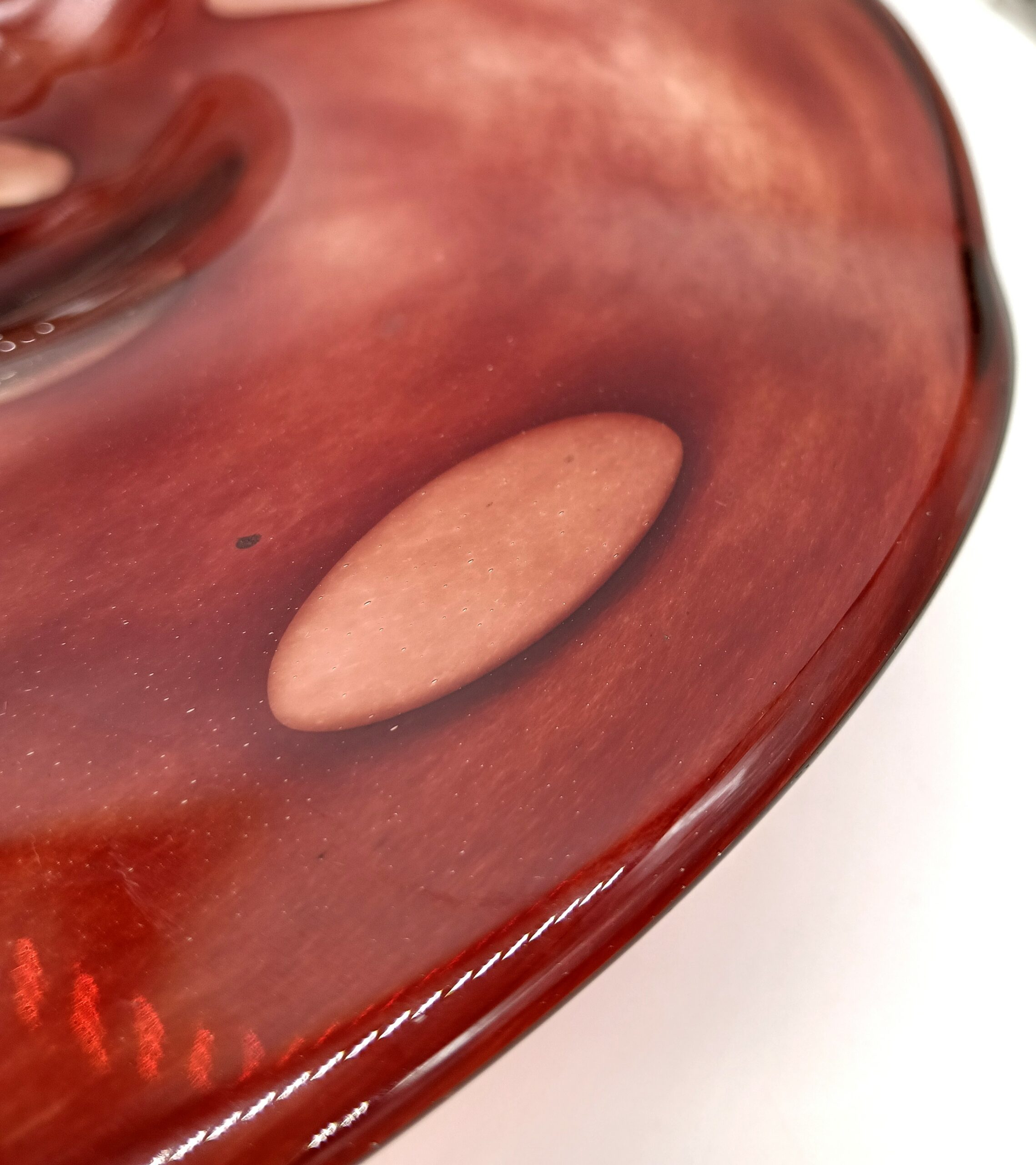 Centro tavola svuotatasche rosso, rotondo con forma somigliante al cappello di un fungo e tipo lavorazione con bolle.
