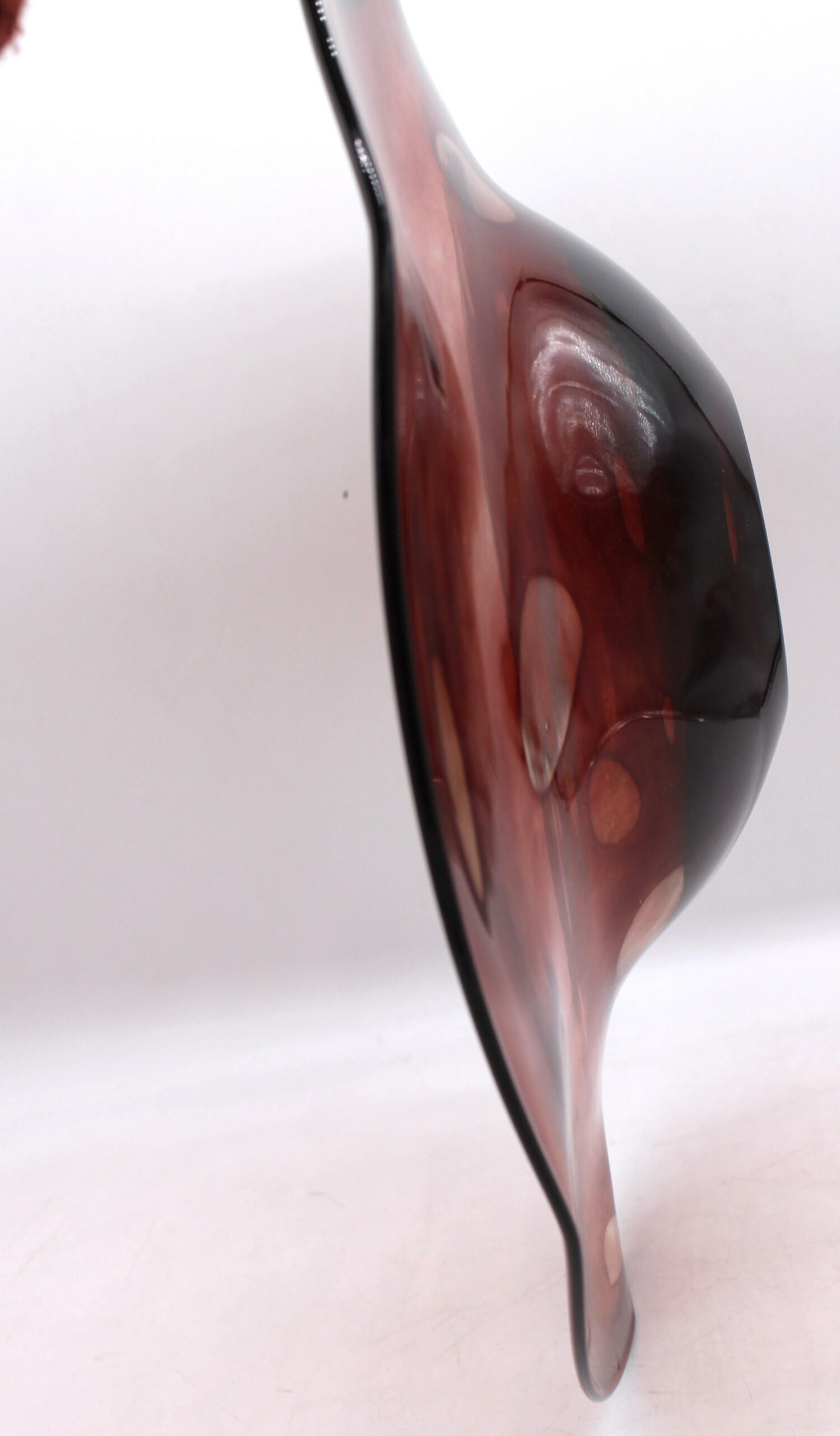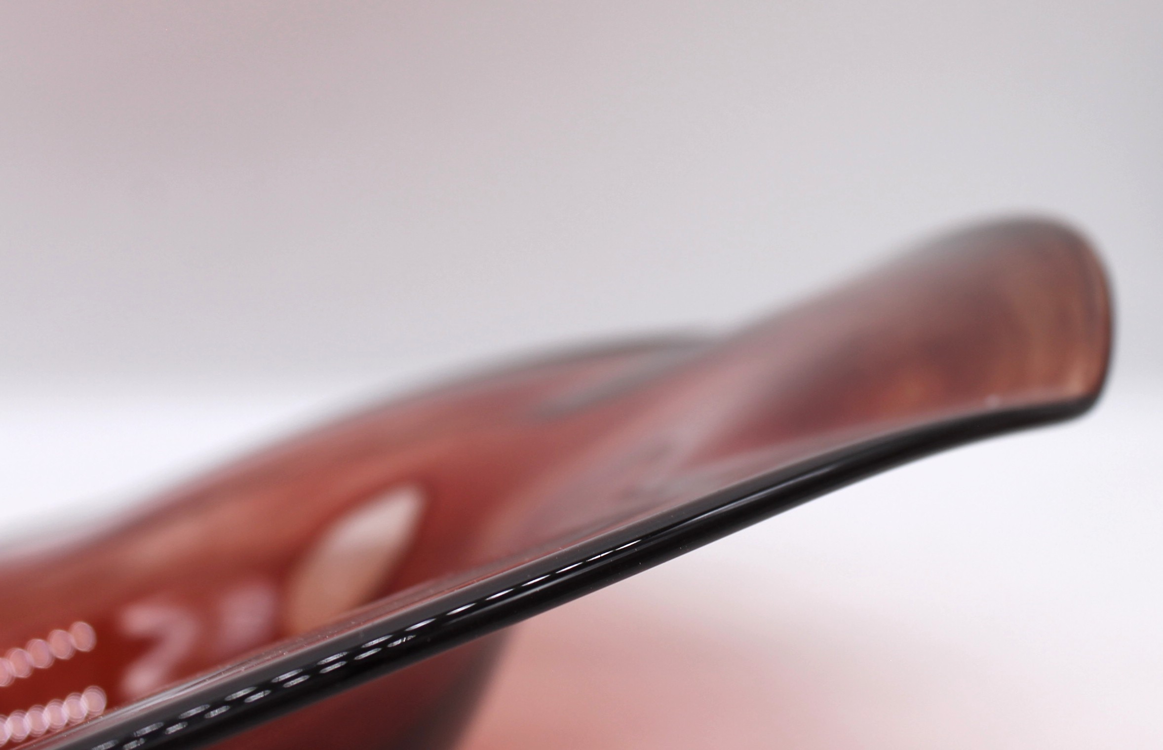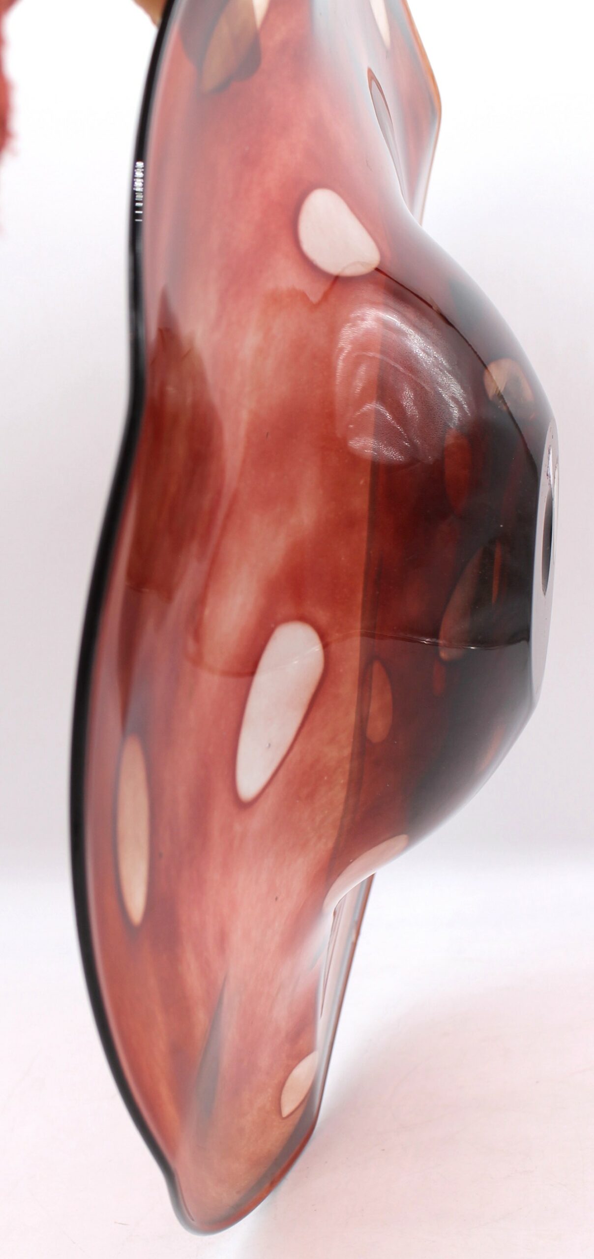 Centro tavola svuotatasche rosso, rotondo con forma somigliante al cappello di un fungo e tipo lavorazione con bolle.