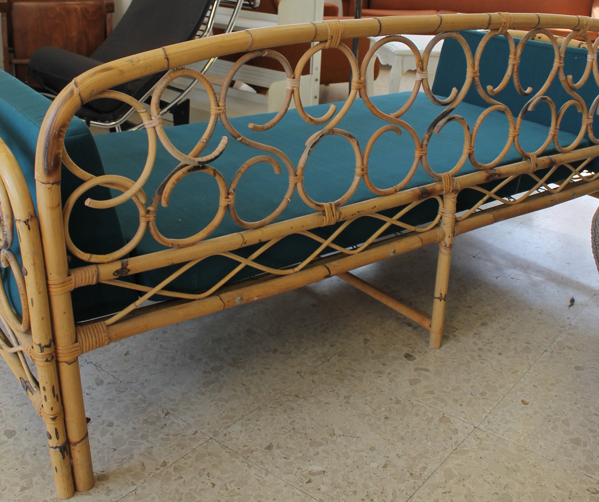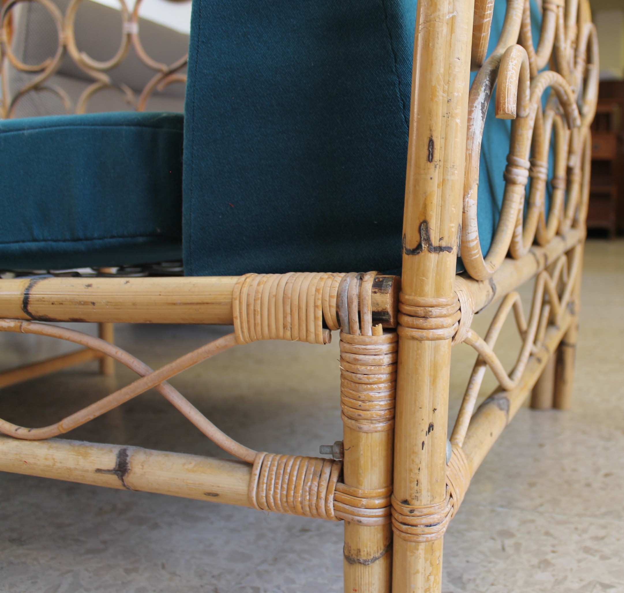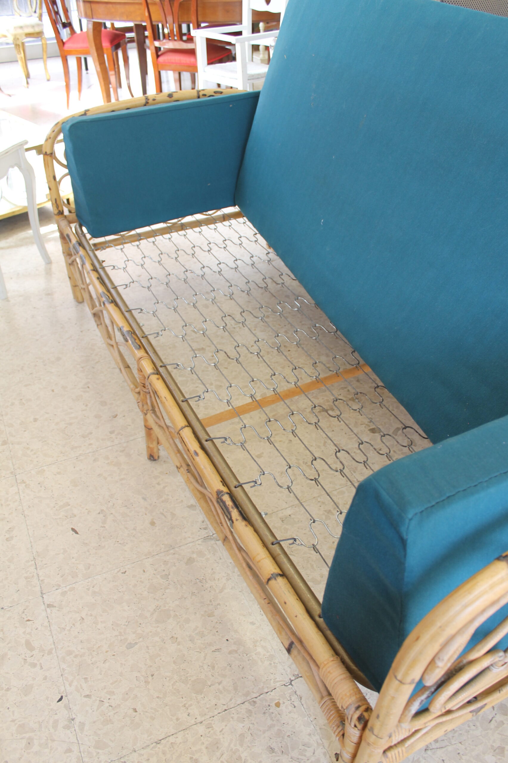 Divano in bamboo con cuscini azzurri. Da rivedere in alcuni punti.