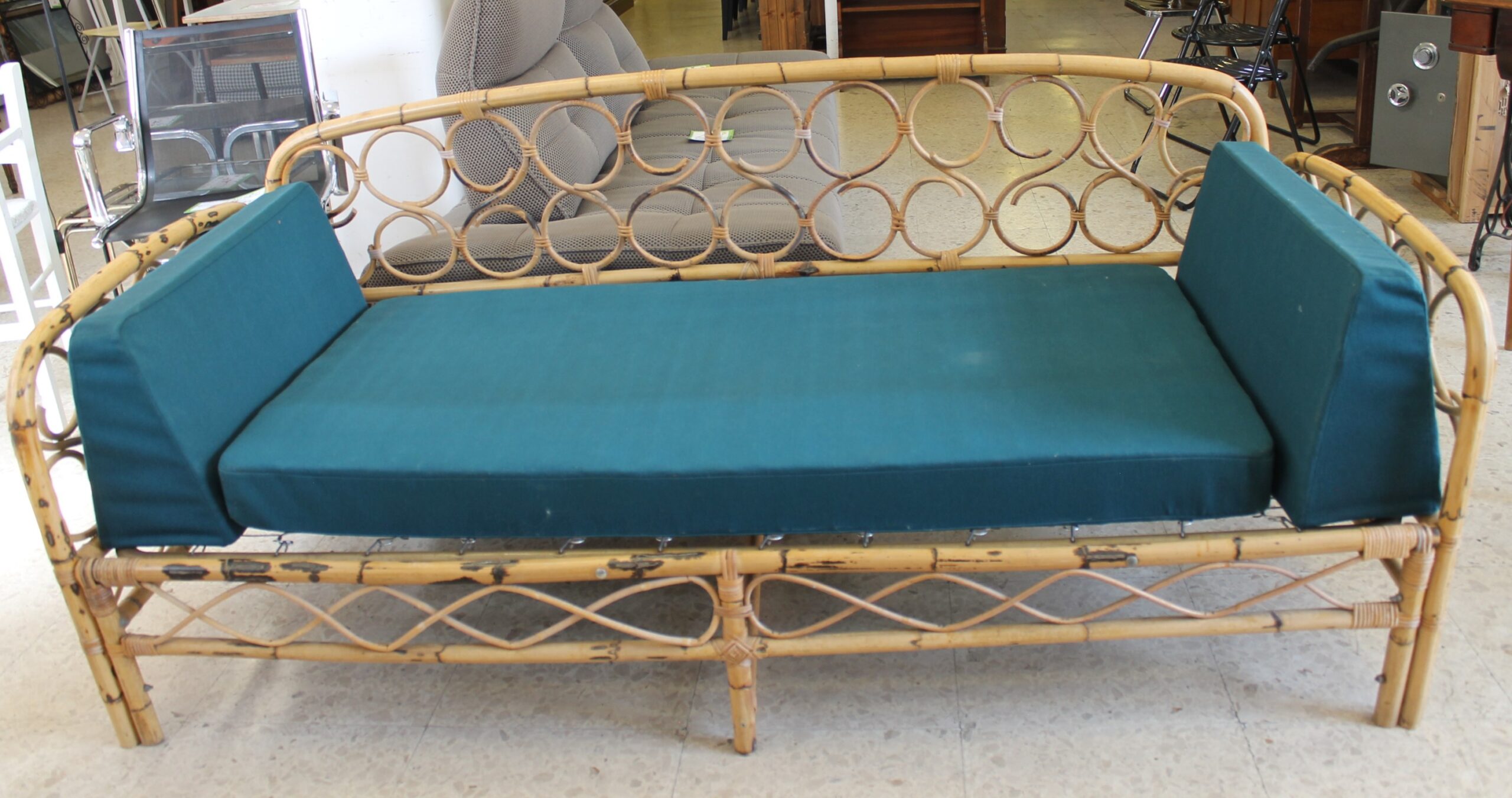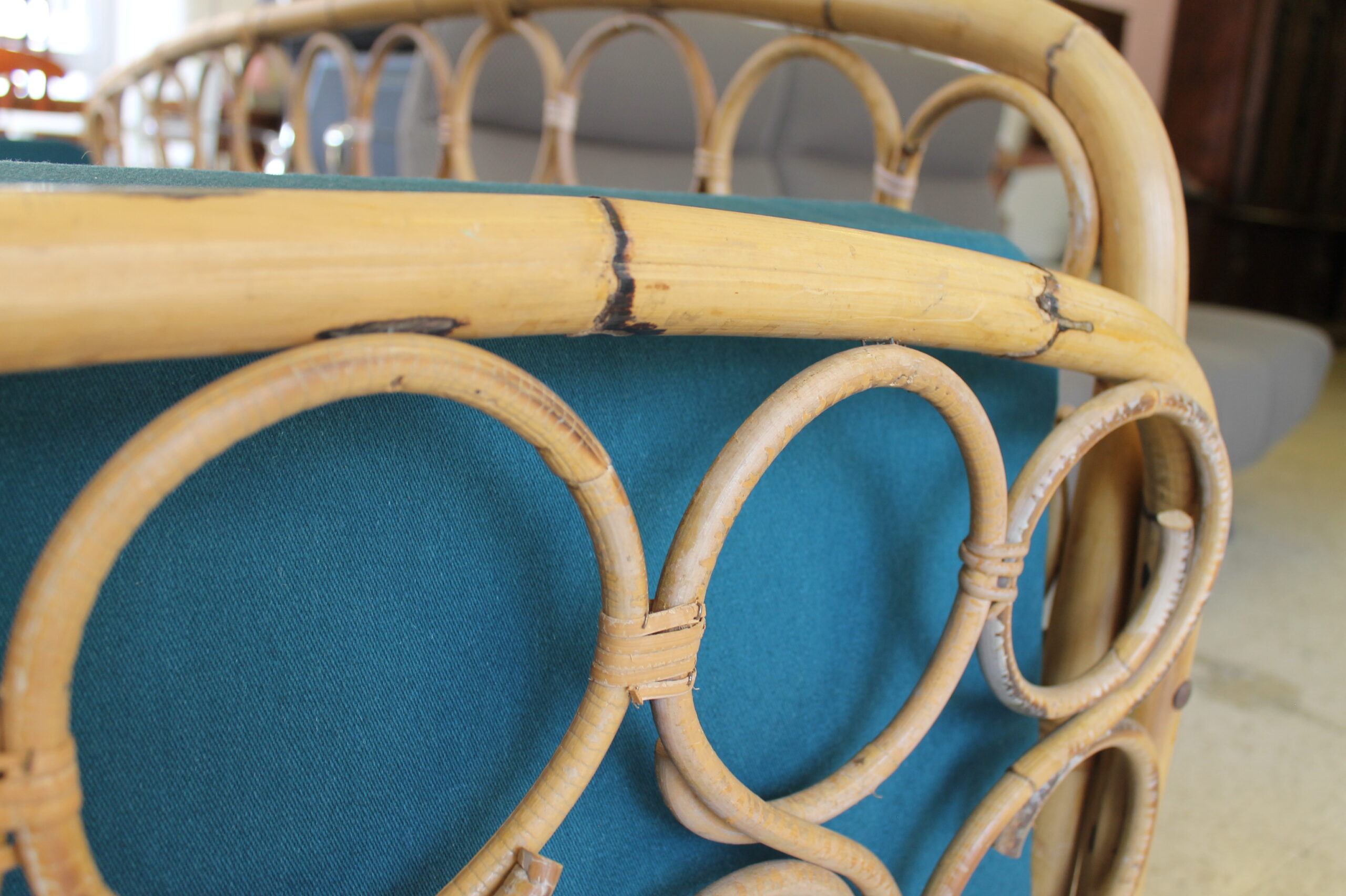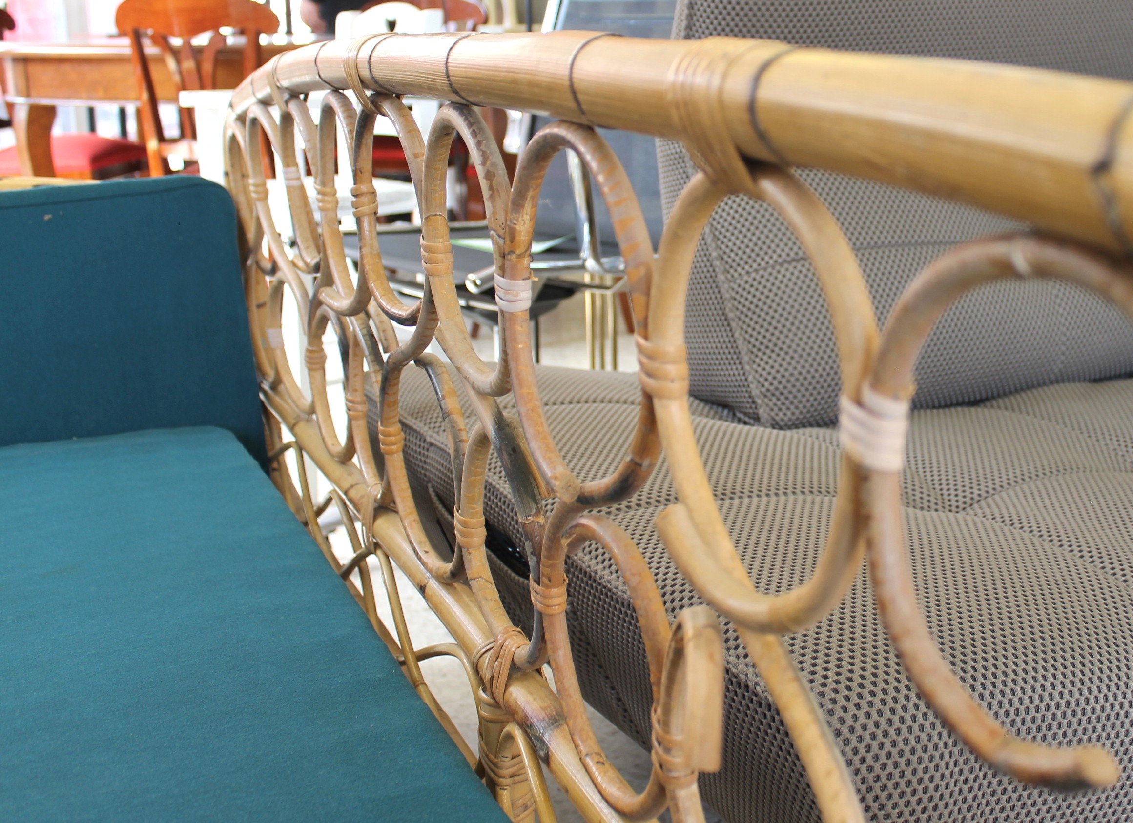 Divano in bamboo con cuscini azzurri. Da rivedere in alcuni punti.