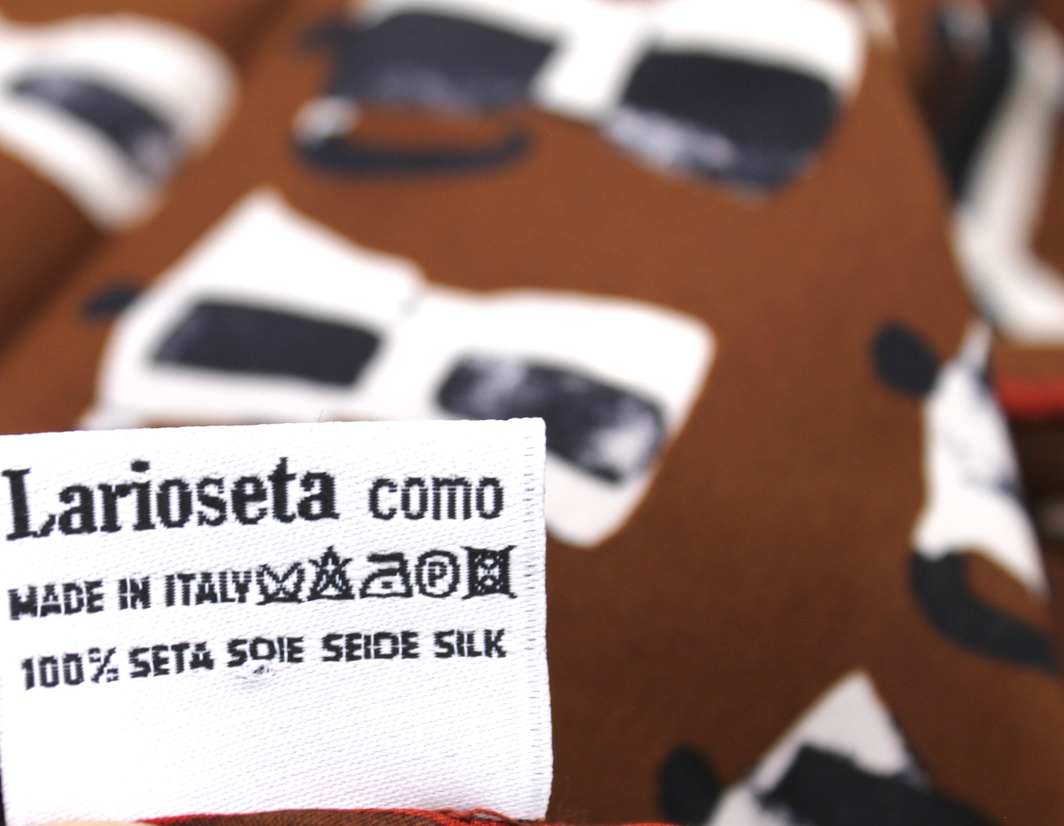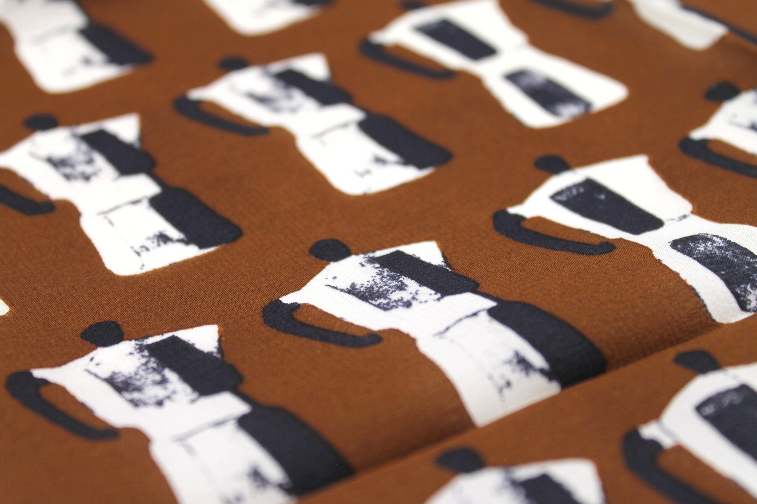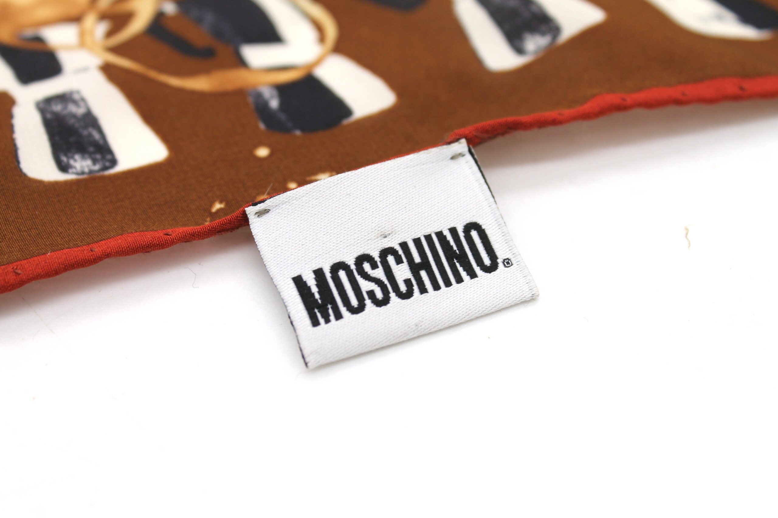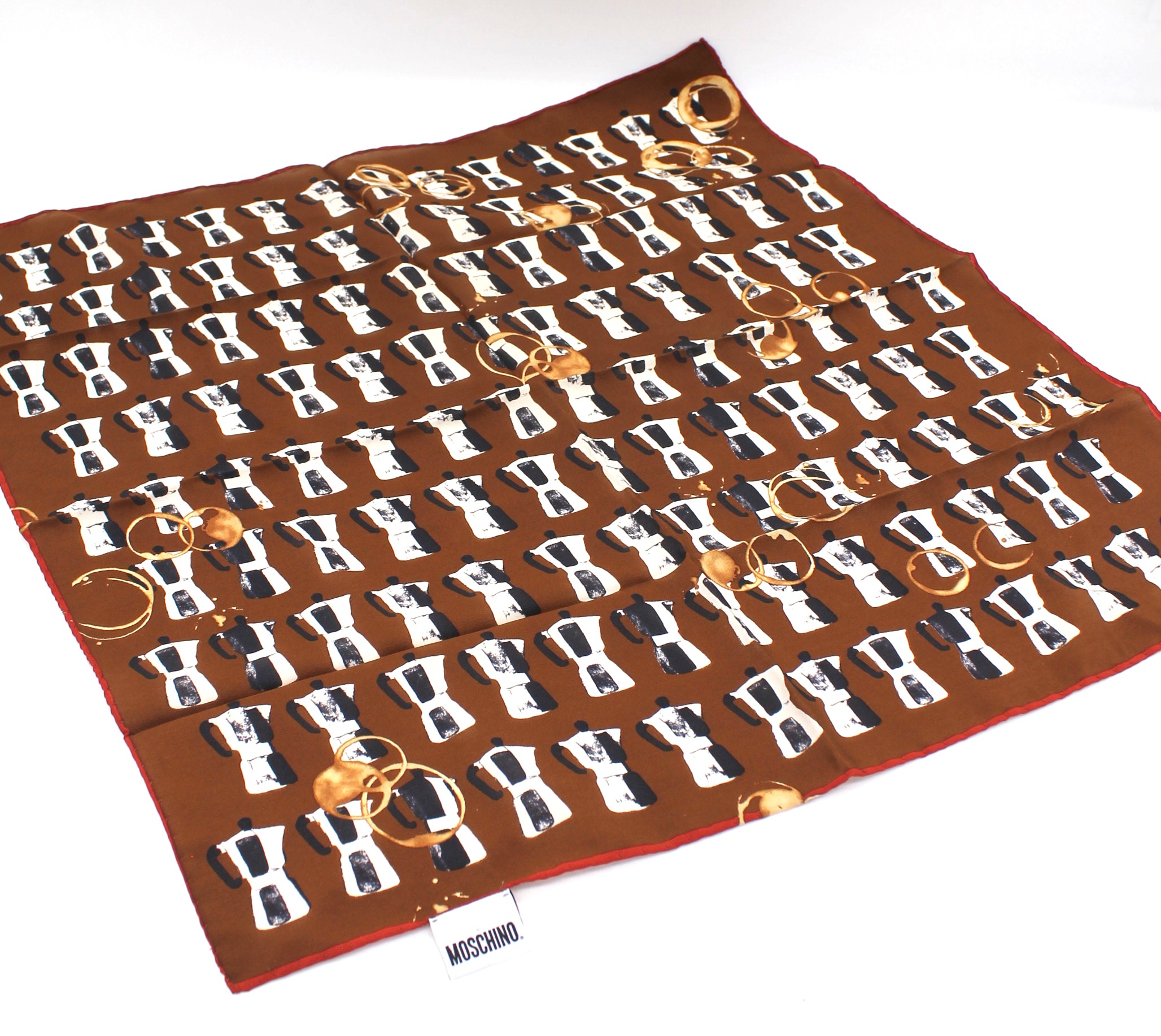 Fazzoletto foulard in seta di Moschino. Decorazione a fantasia con caffettiere/moka sulle tonalità del marrone.