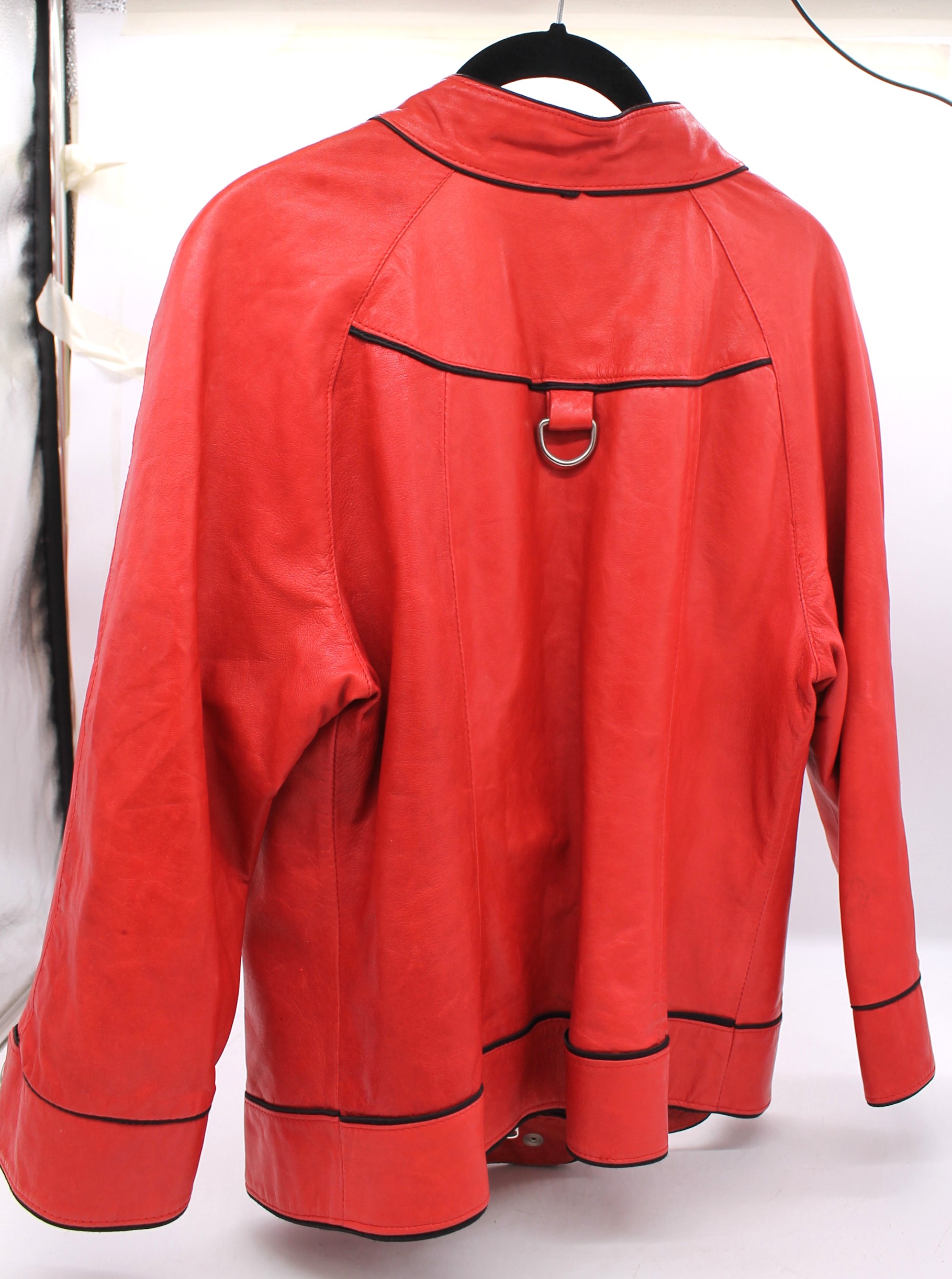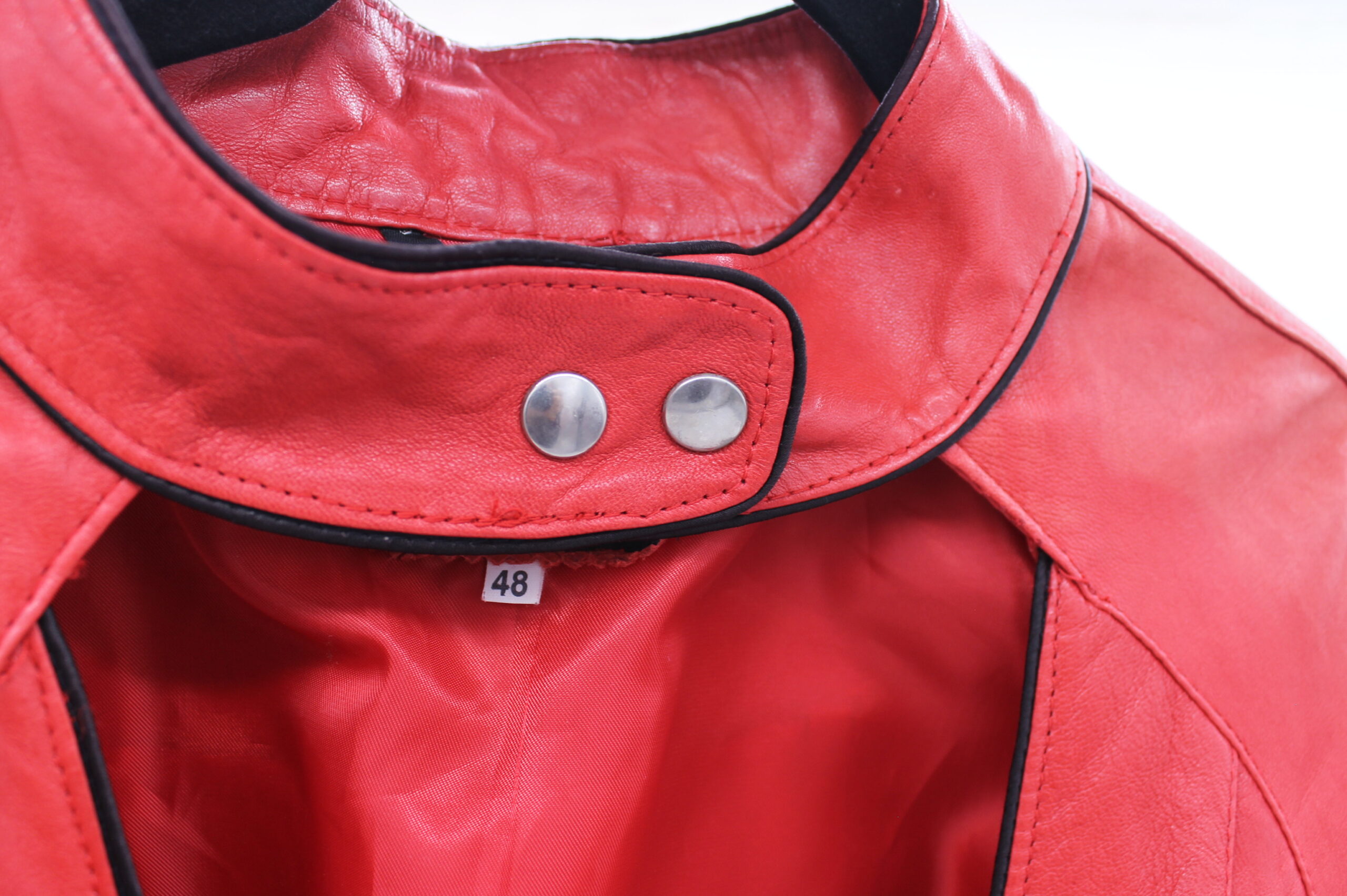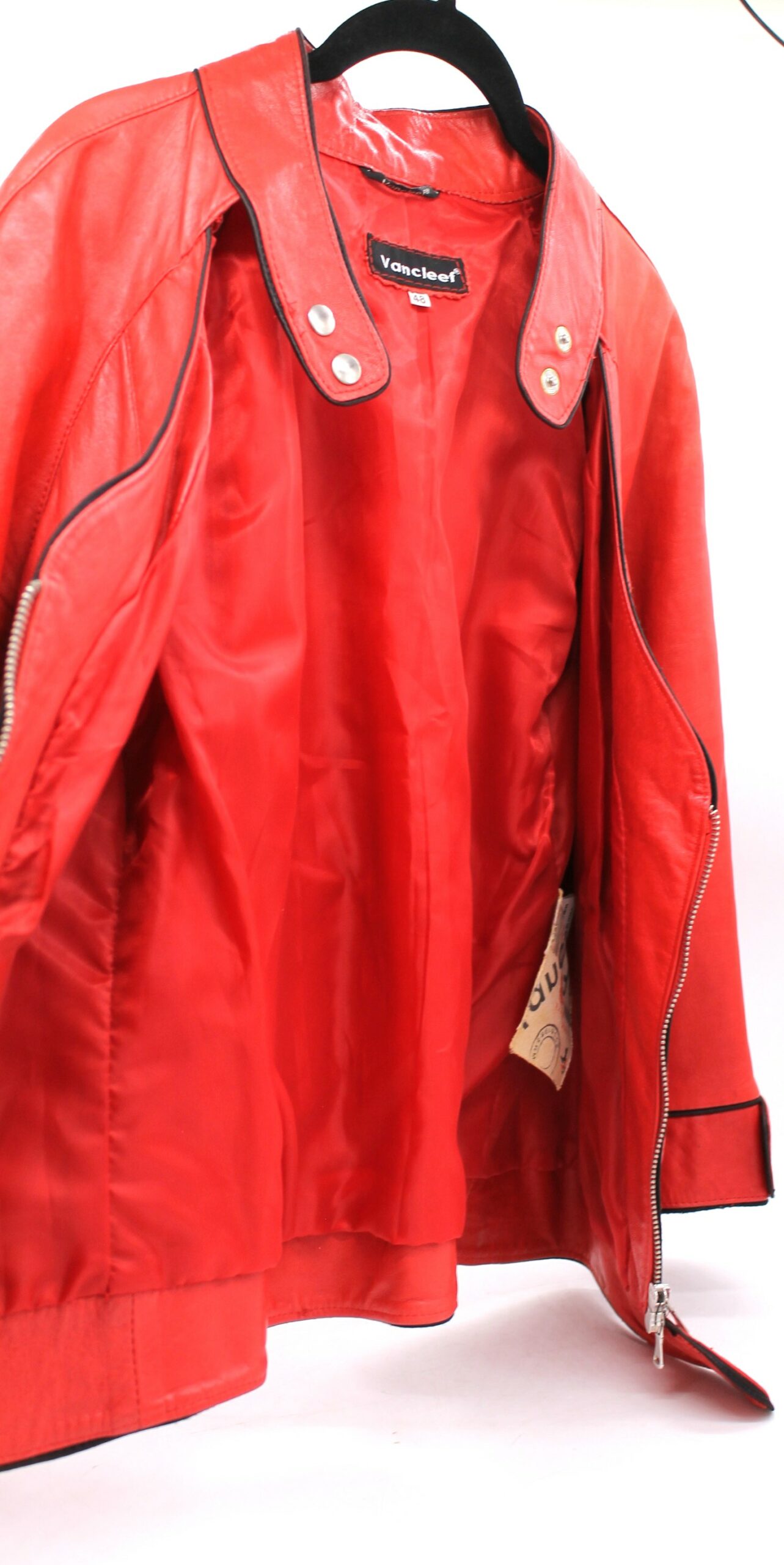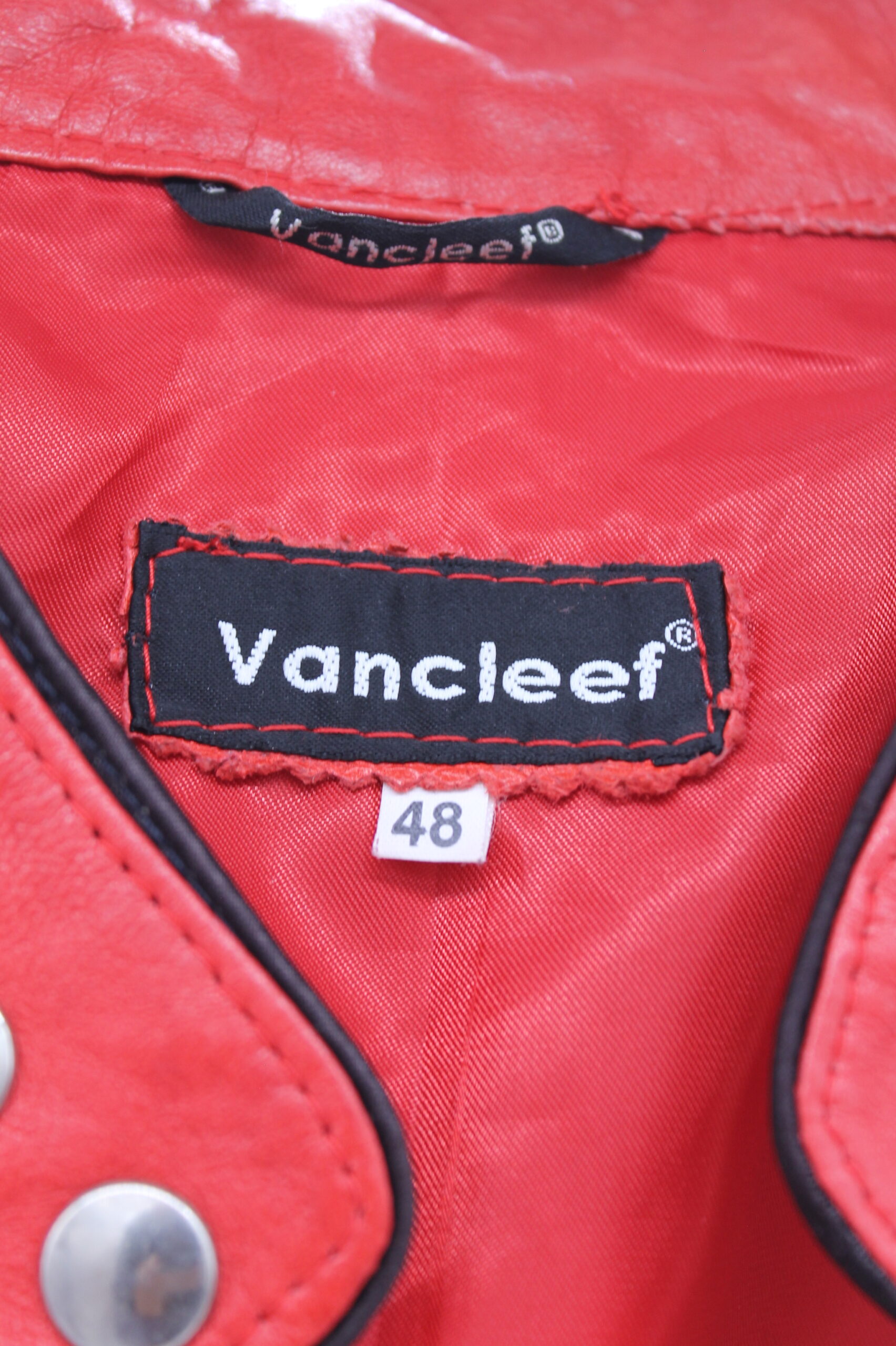 Giacca vintage Vancleef in vera pelle colore rosso, inserti neri.