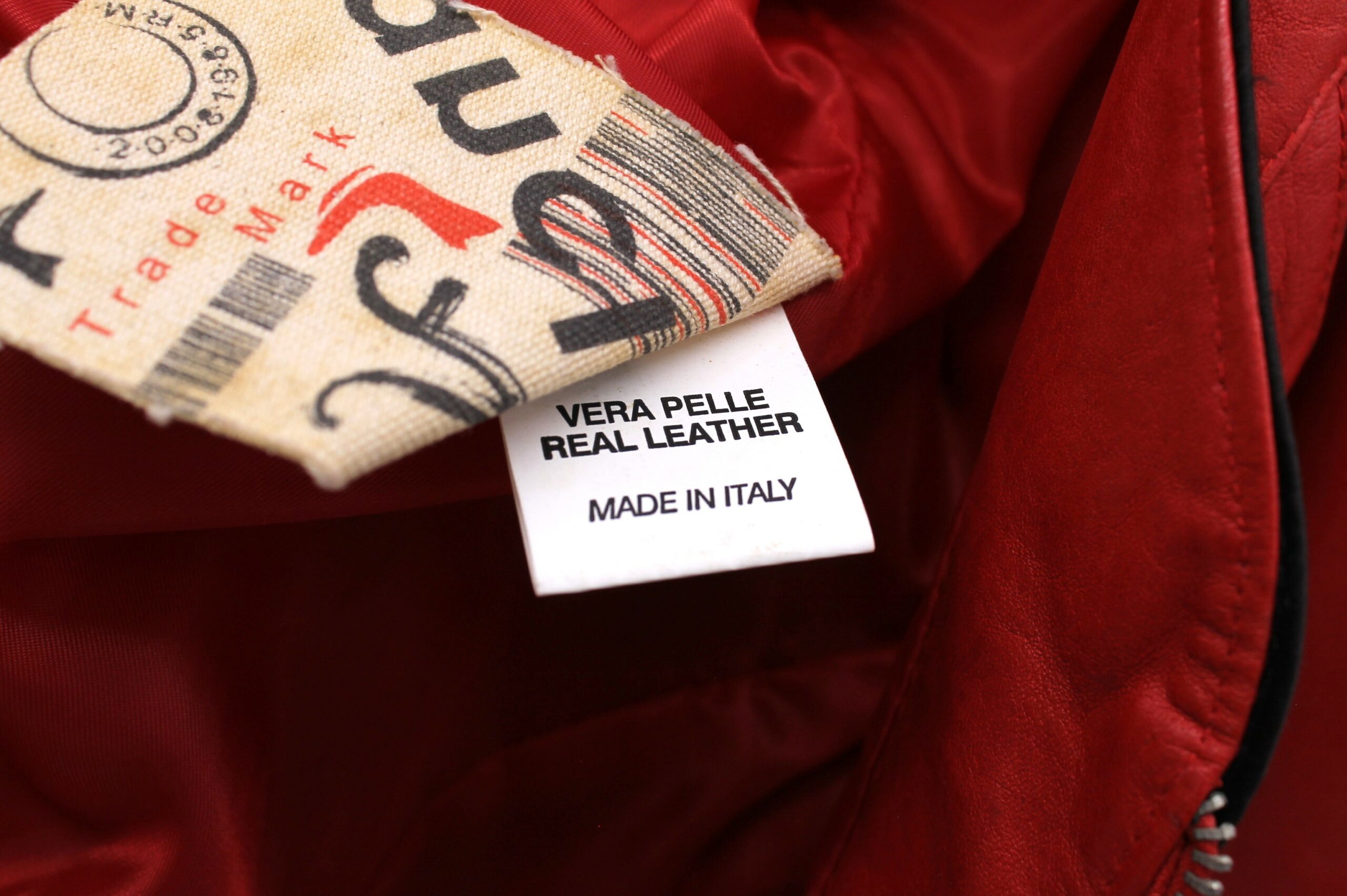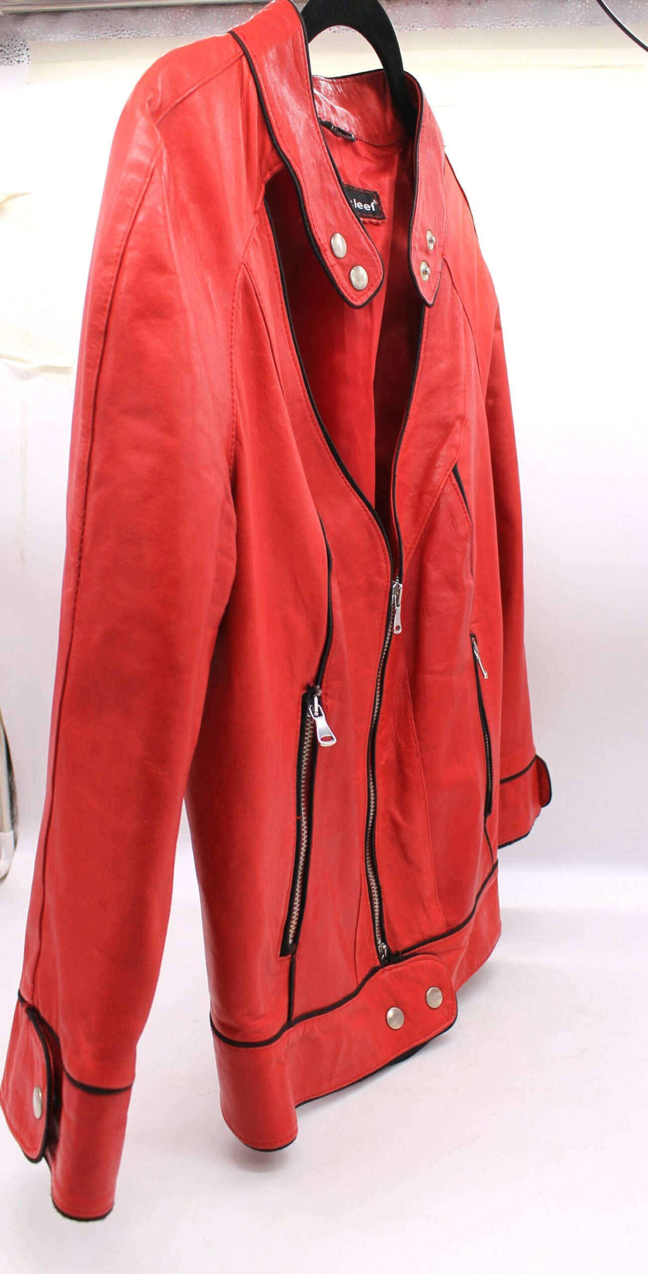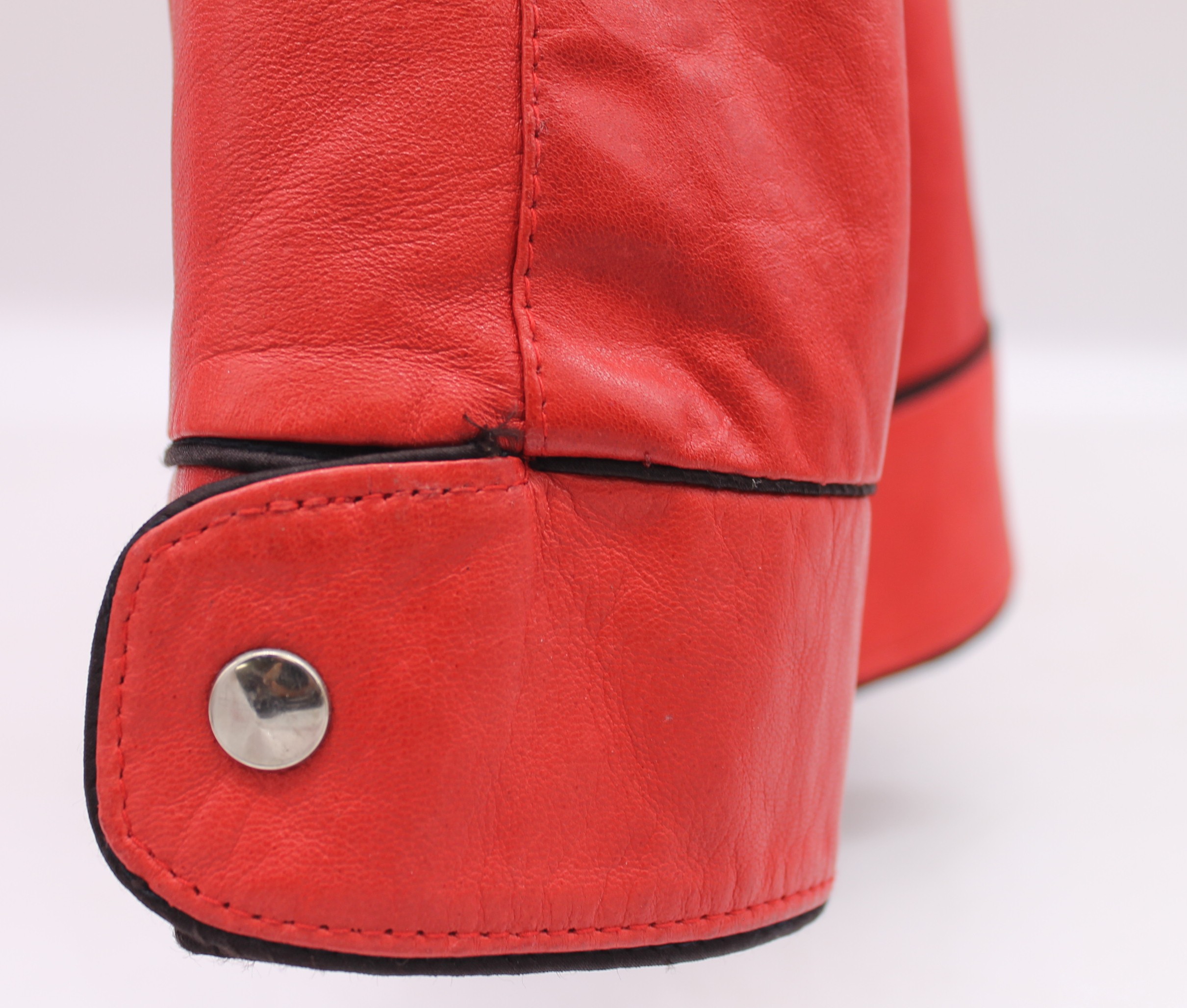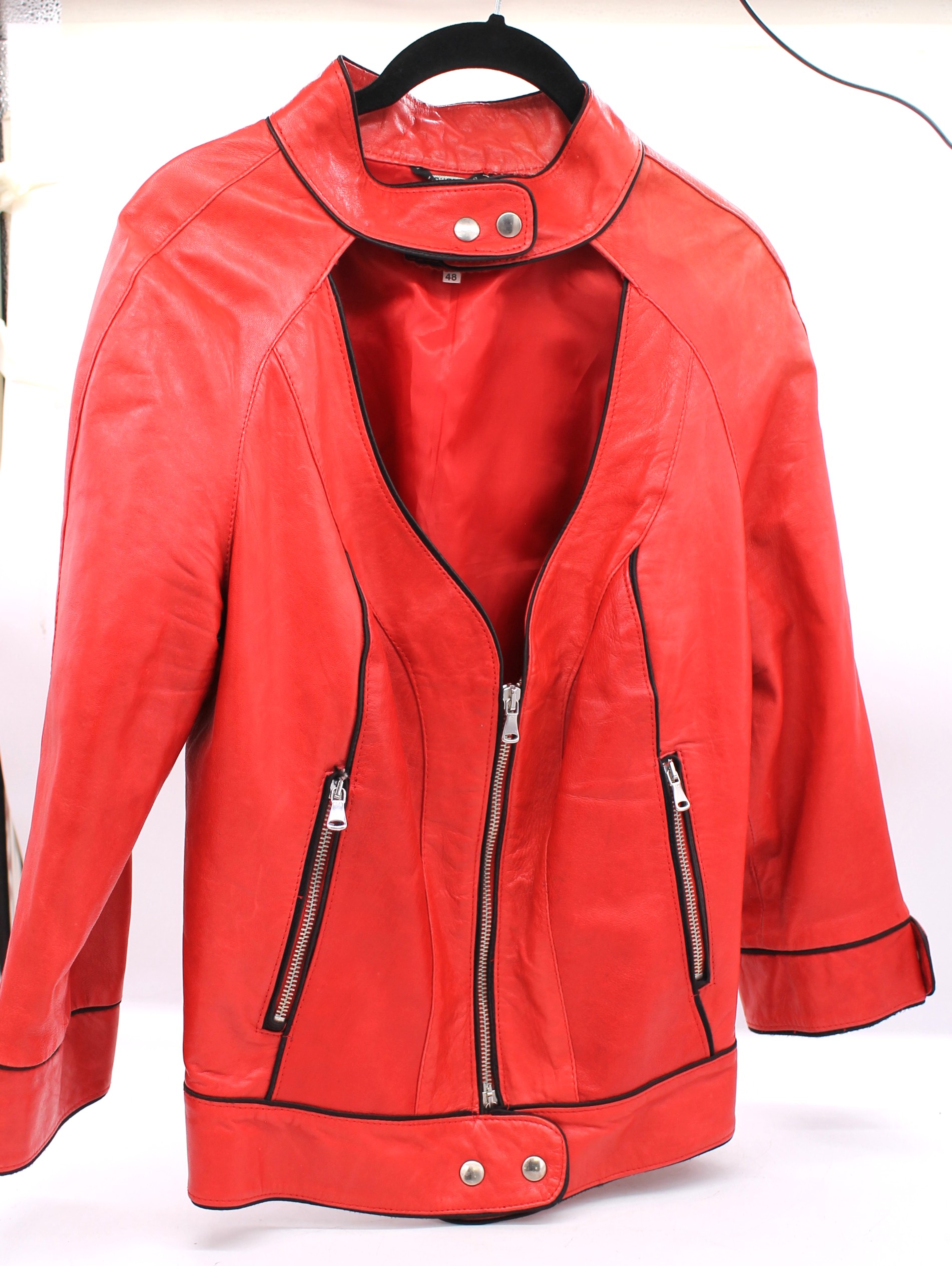Giacca vintage Vancleef in vera pelle colore rosso, inserti neri.