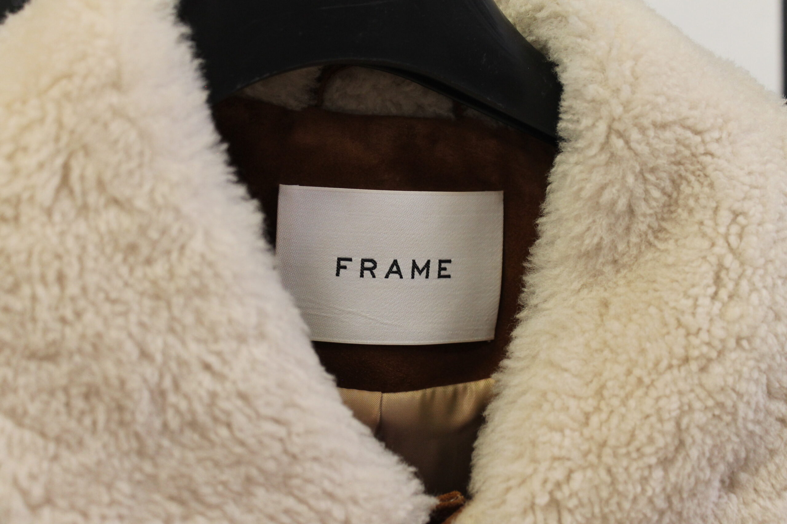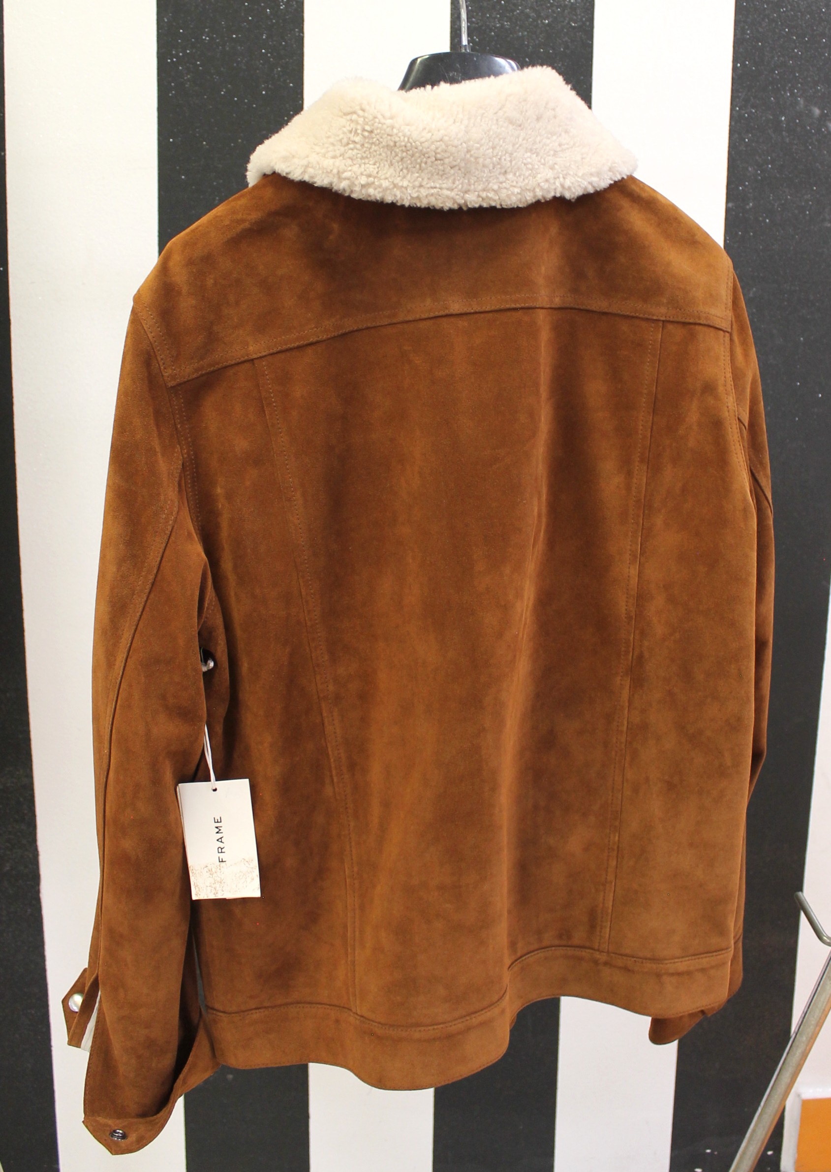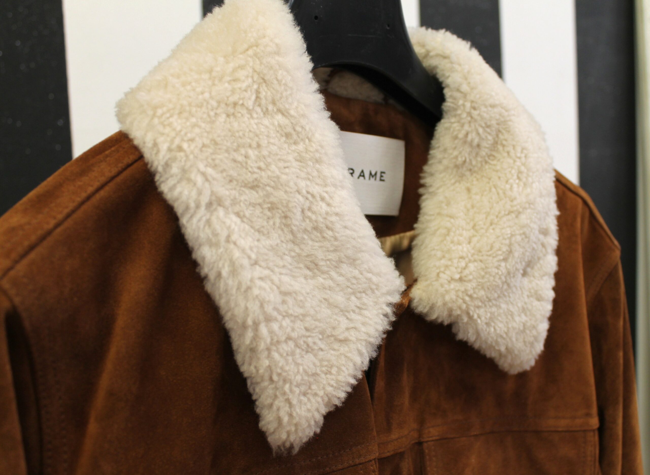 Giacchetto Frame scamosciato color marrone con collo pellicciato bianco.
