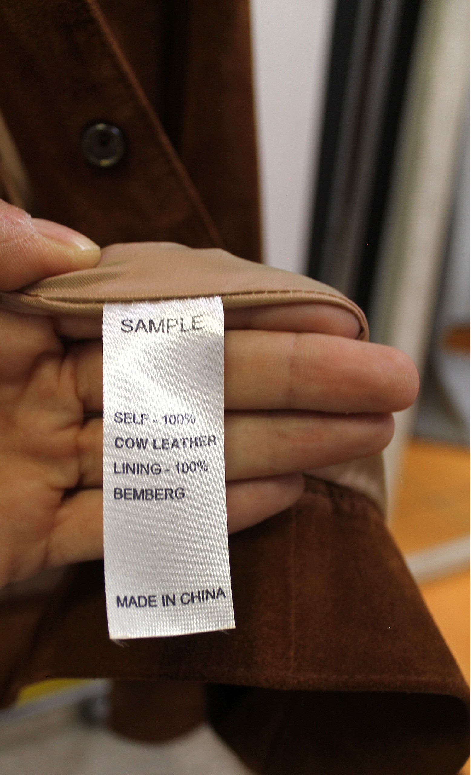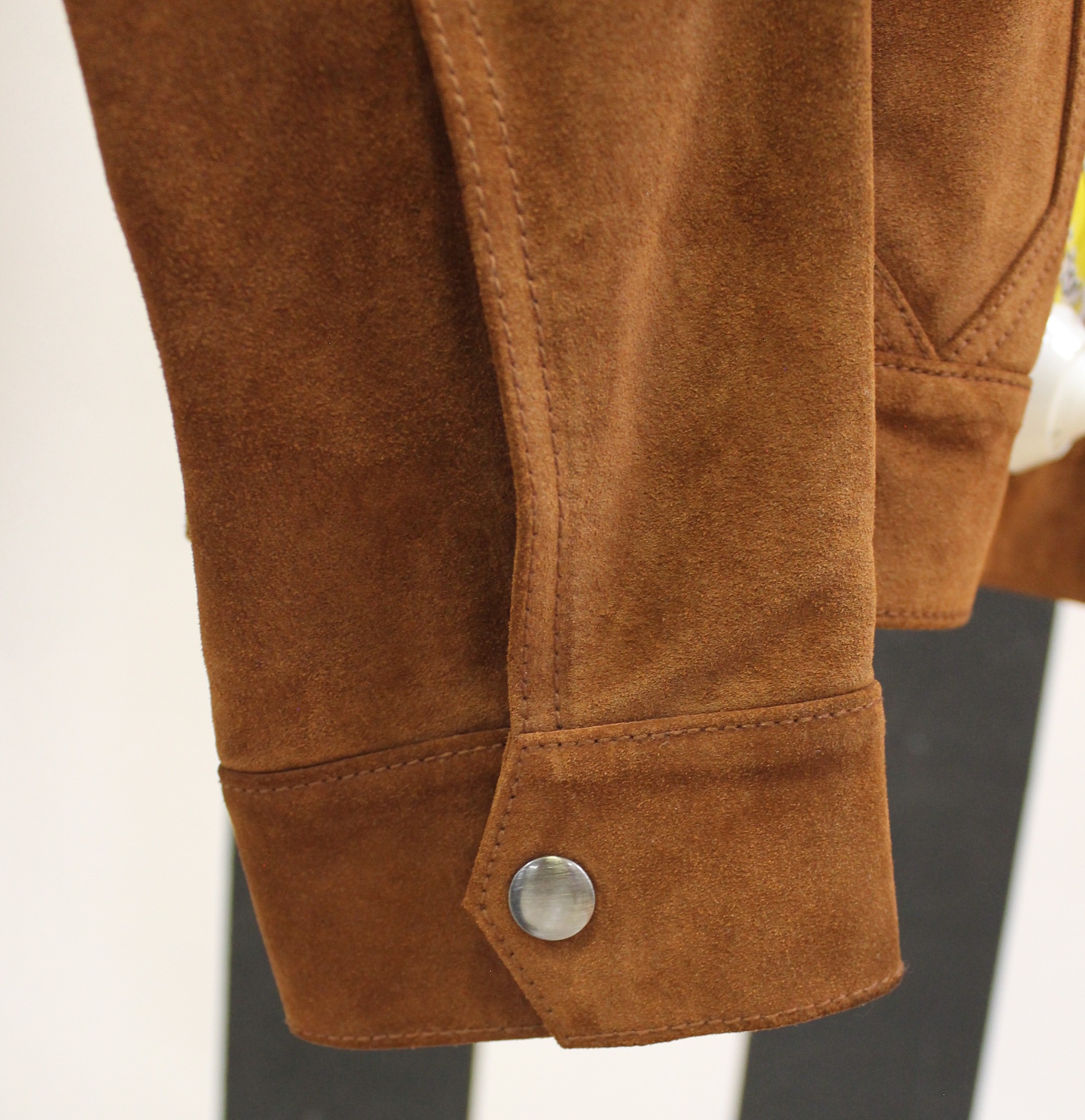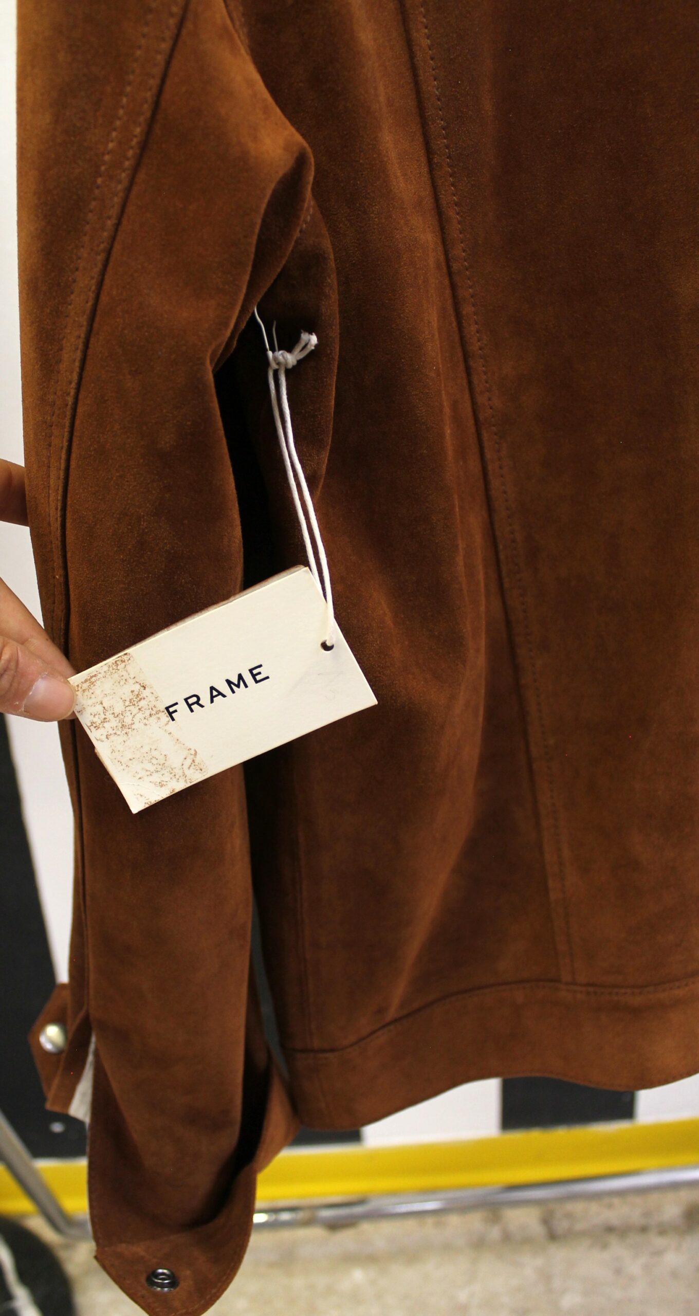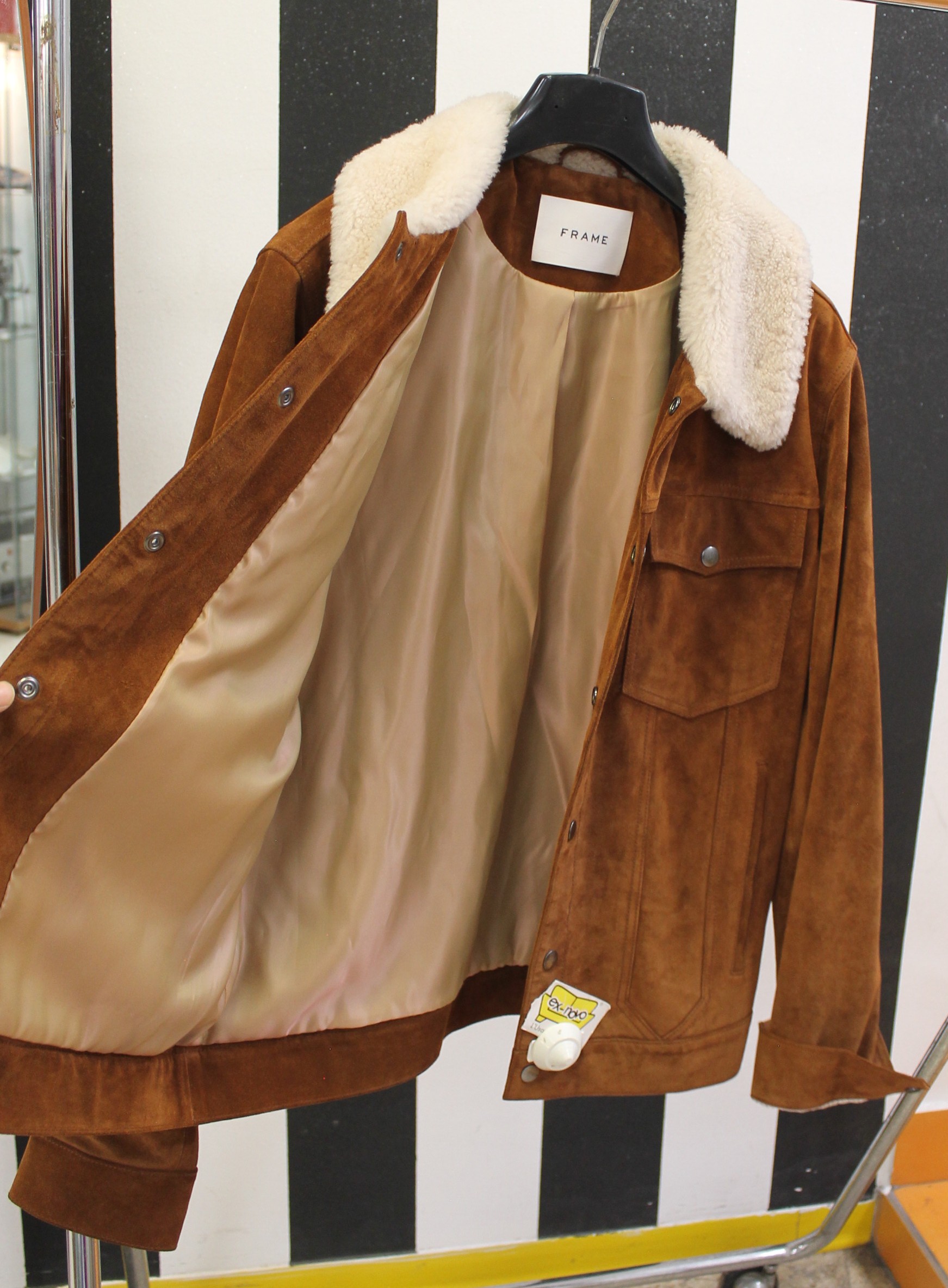Giacchetto Frame scamosciato color marrone con collo pellicciato bianco.