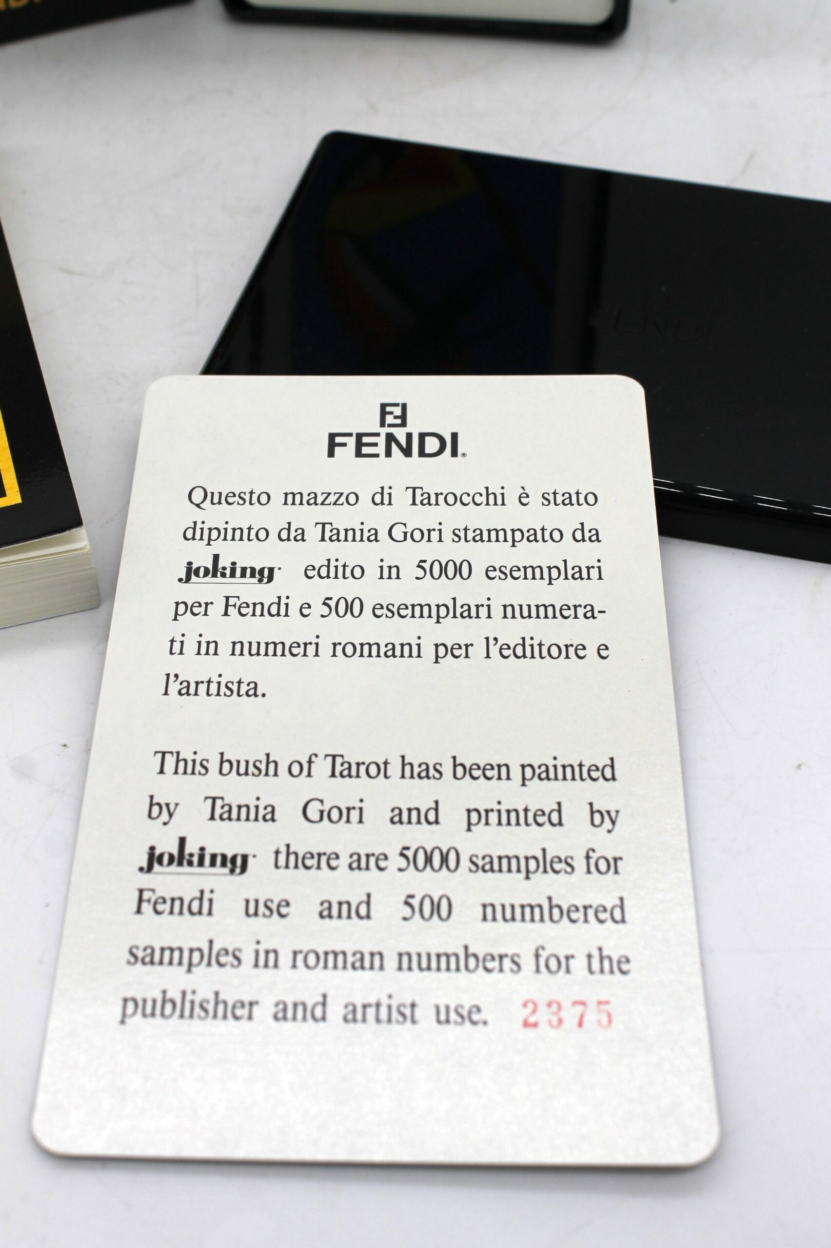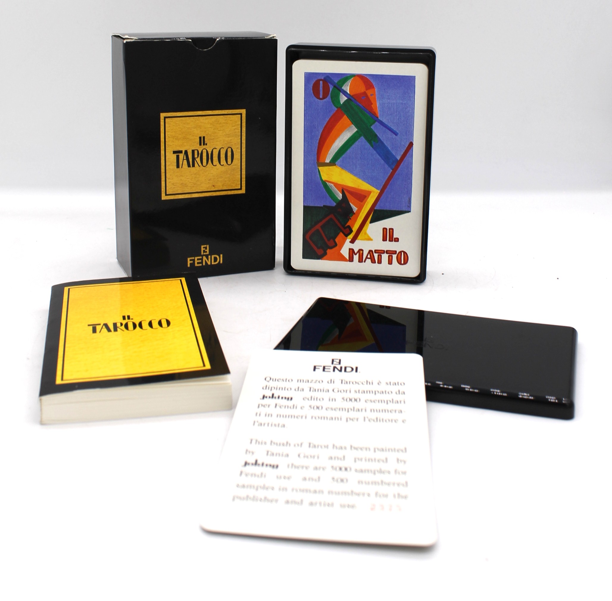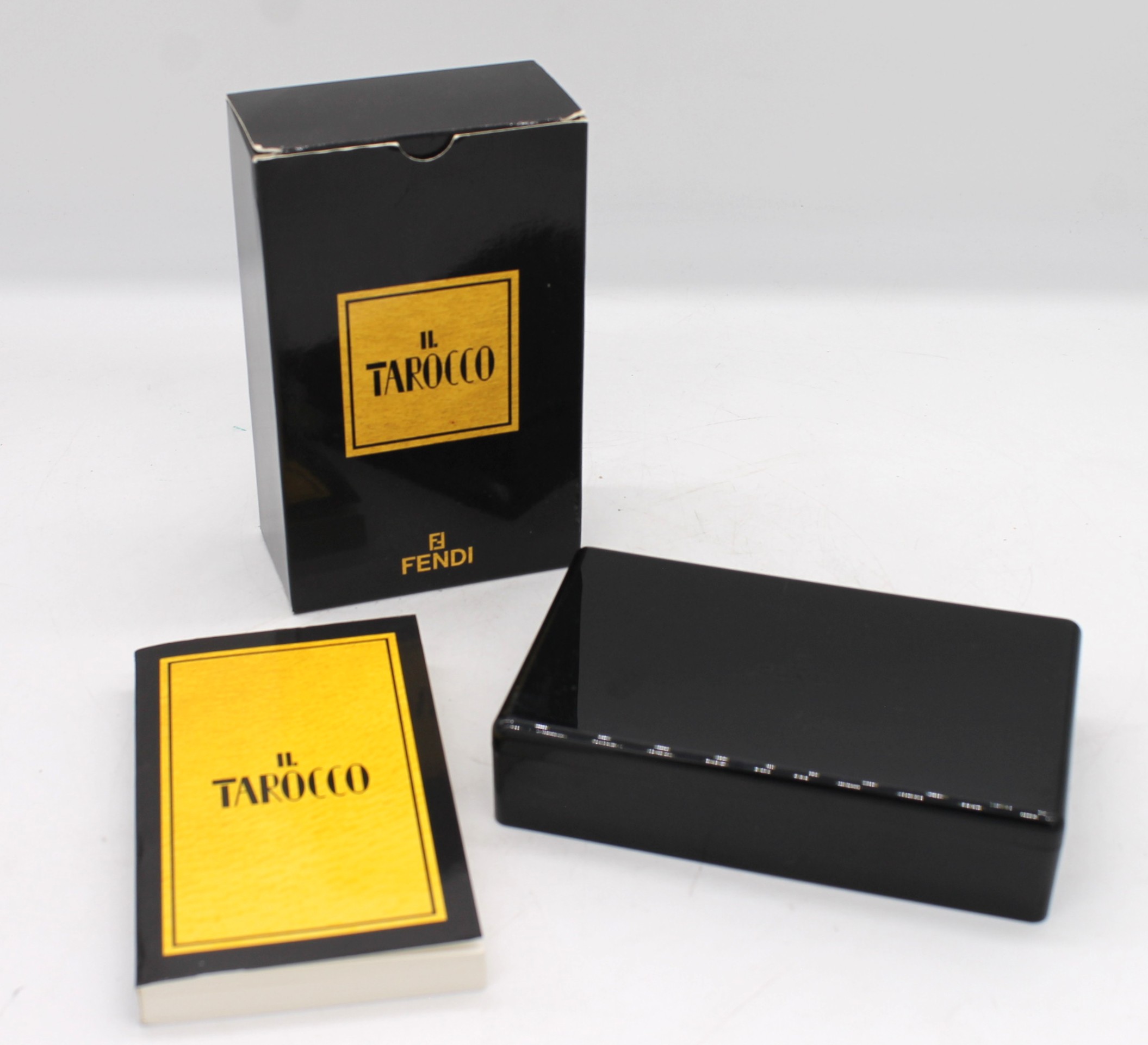 Include un mazzo di tarocchi con 78 carte in una scatola di plastica nera e un libretto di istruzioni con illustrazioni a colori degli arcani (scritto in italiano e inglese). Il set è contenuto in una scatola di cartone nera con il logo Fendi. Questo set è il numero 2375.