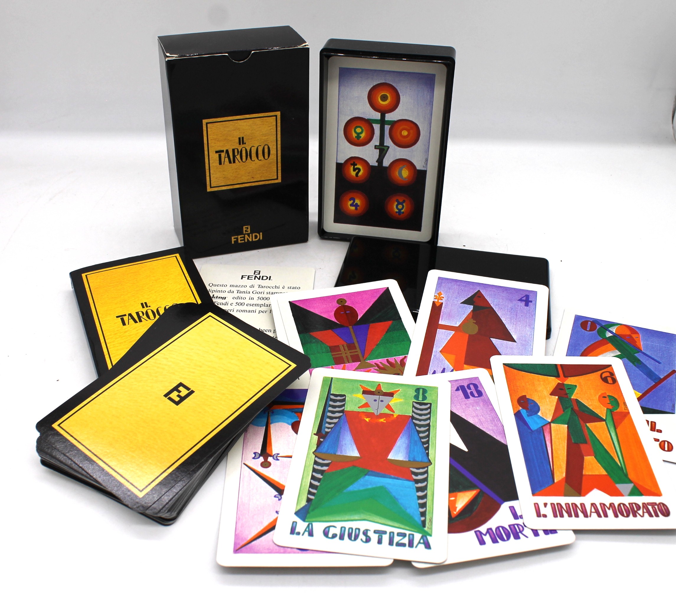 Iconico set di tarocchi Fendi illustrato dall’artista italiana Tania Gori e pubblicato dalla famosa casa di moda italiana di lusso Fendi. Il mazzo è stato prodotto da Joking Publishing (a Firenze, Italia) nel 1989 in un’edizione limitata di 5000 copie per la distribuzione da parte di Fendi.