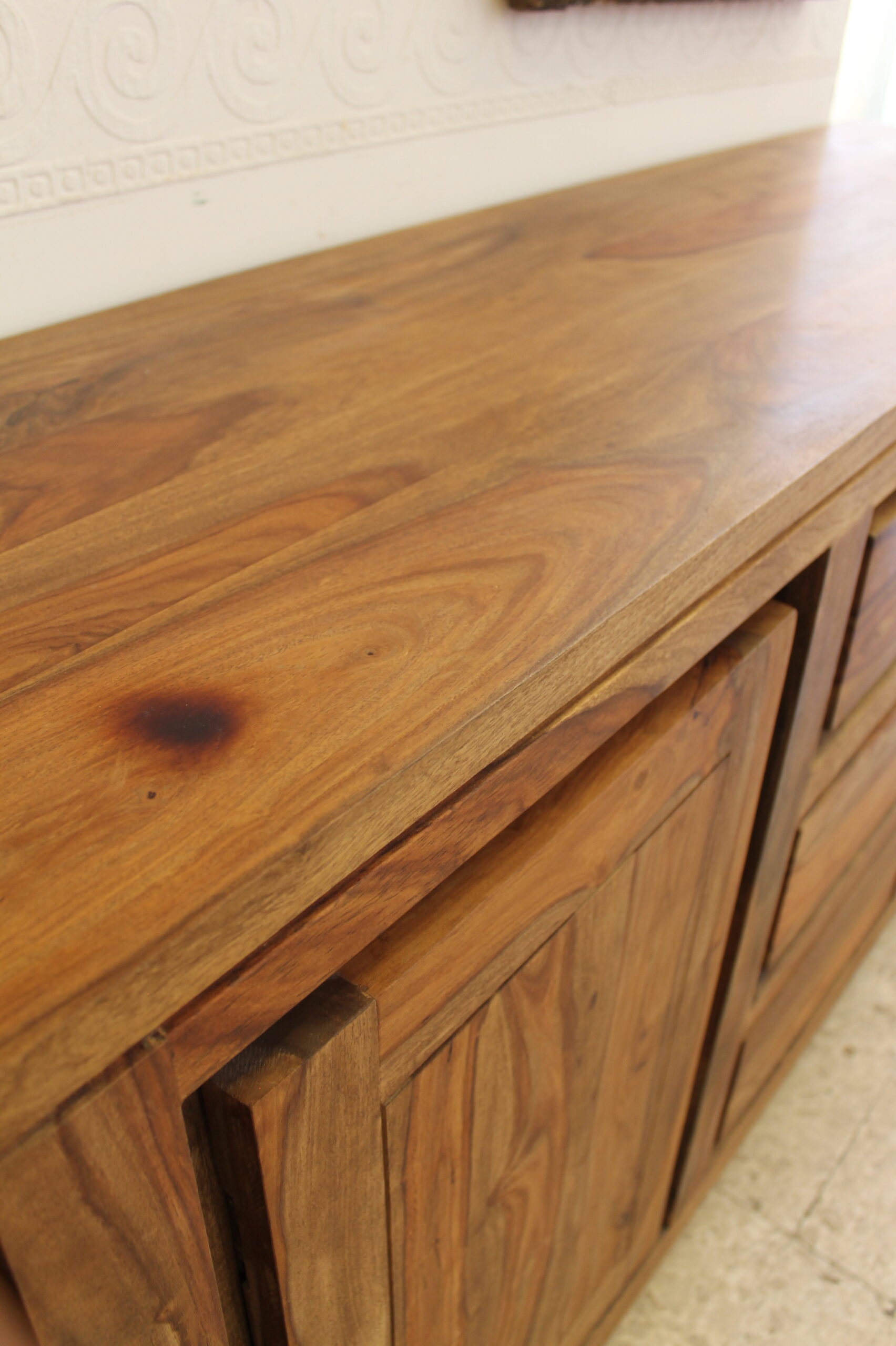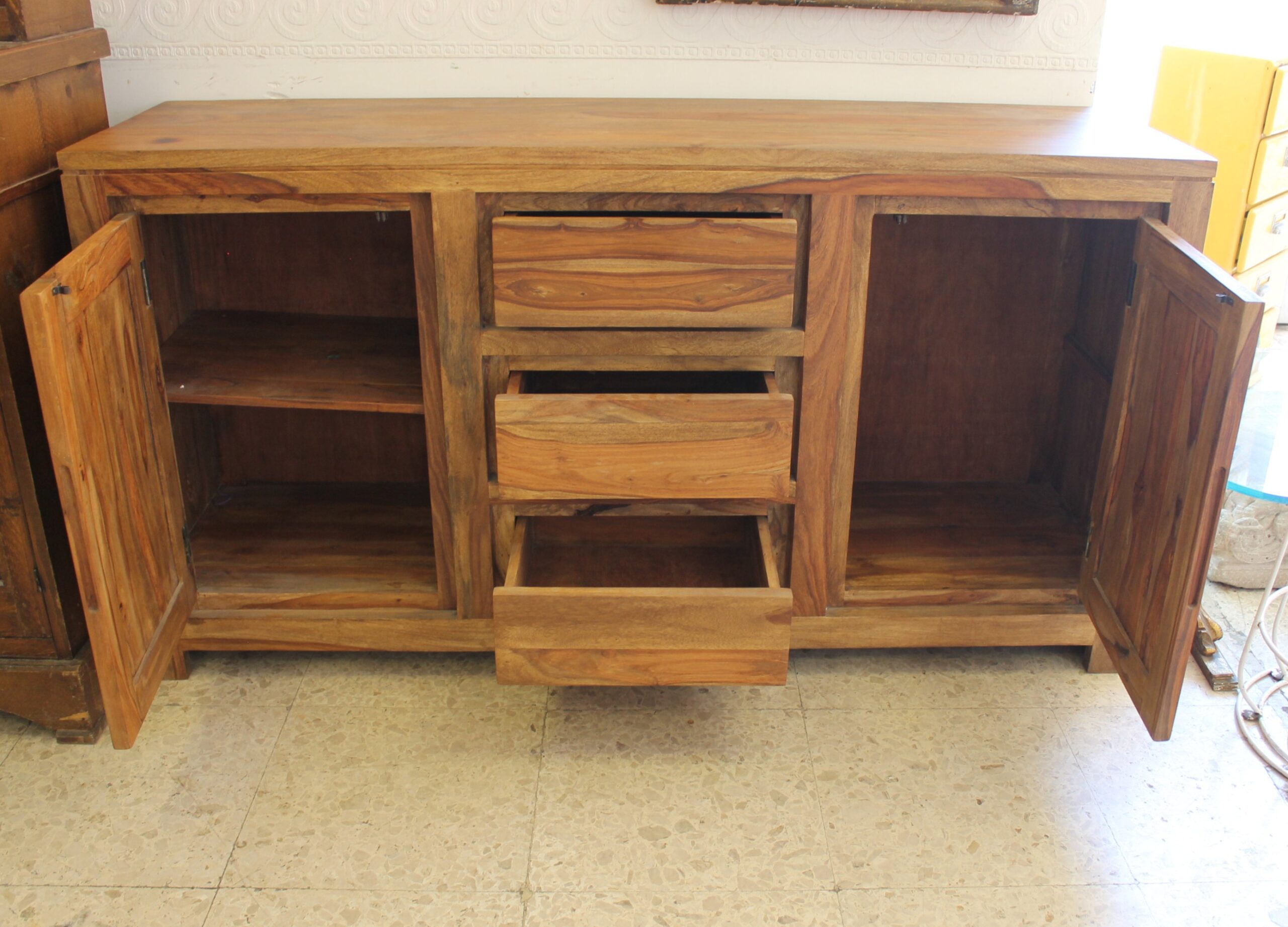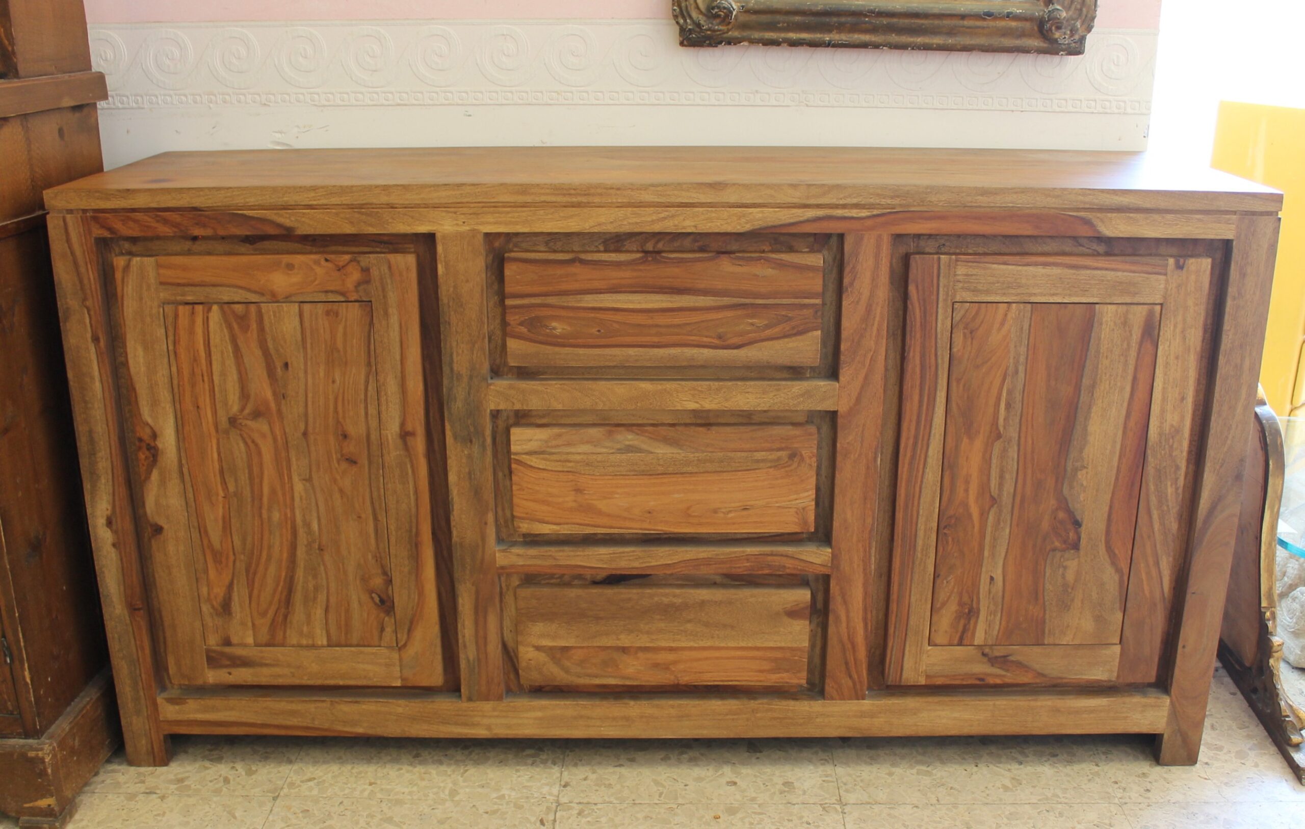 Mobile credenza etnica con due ante e tre cassetti.