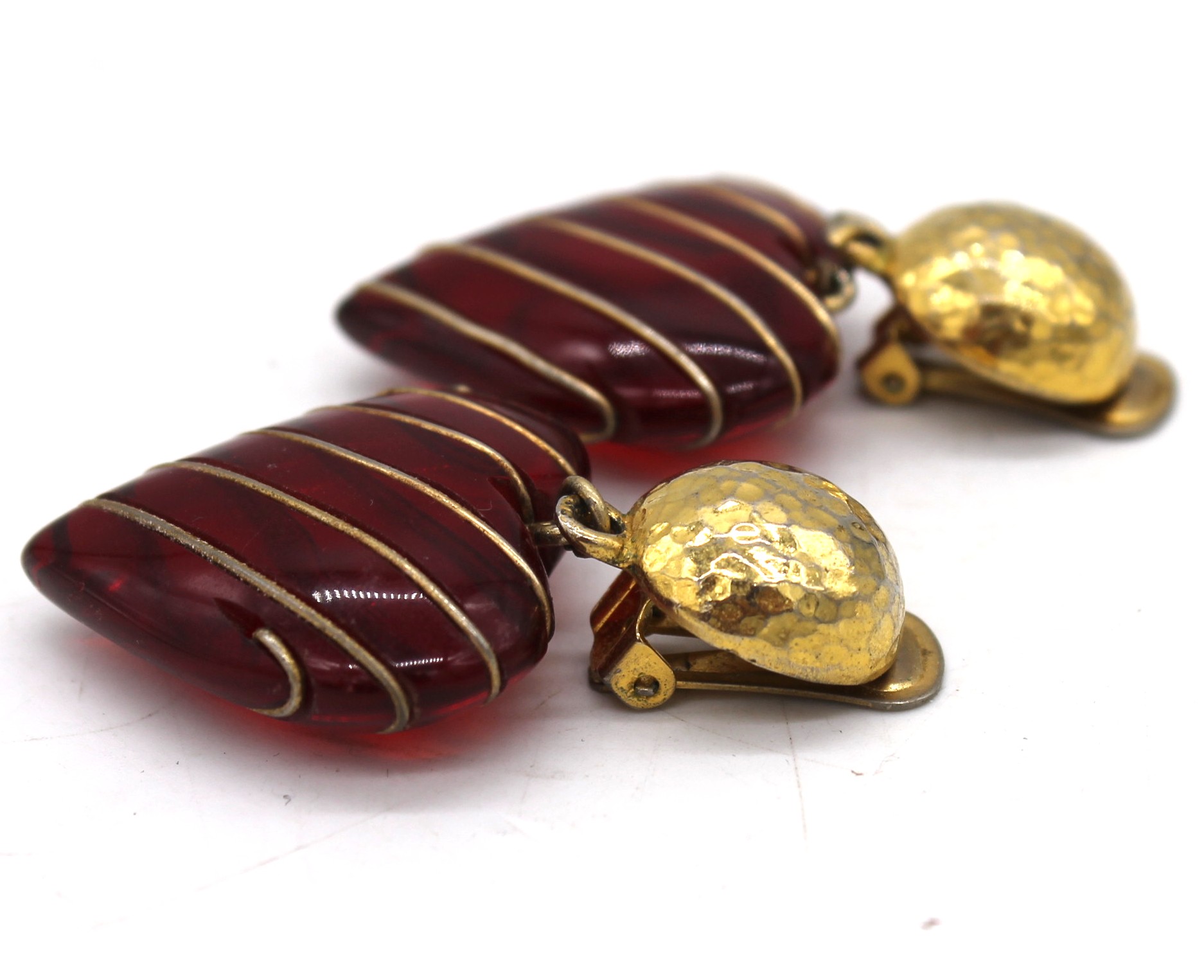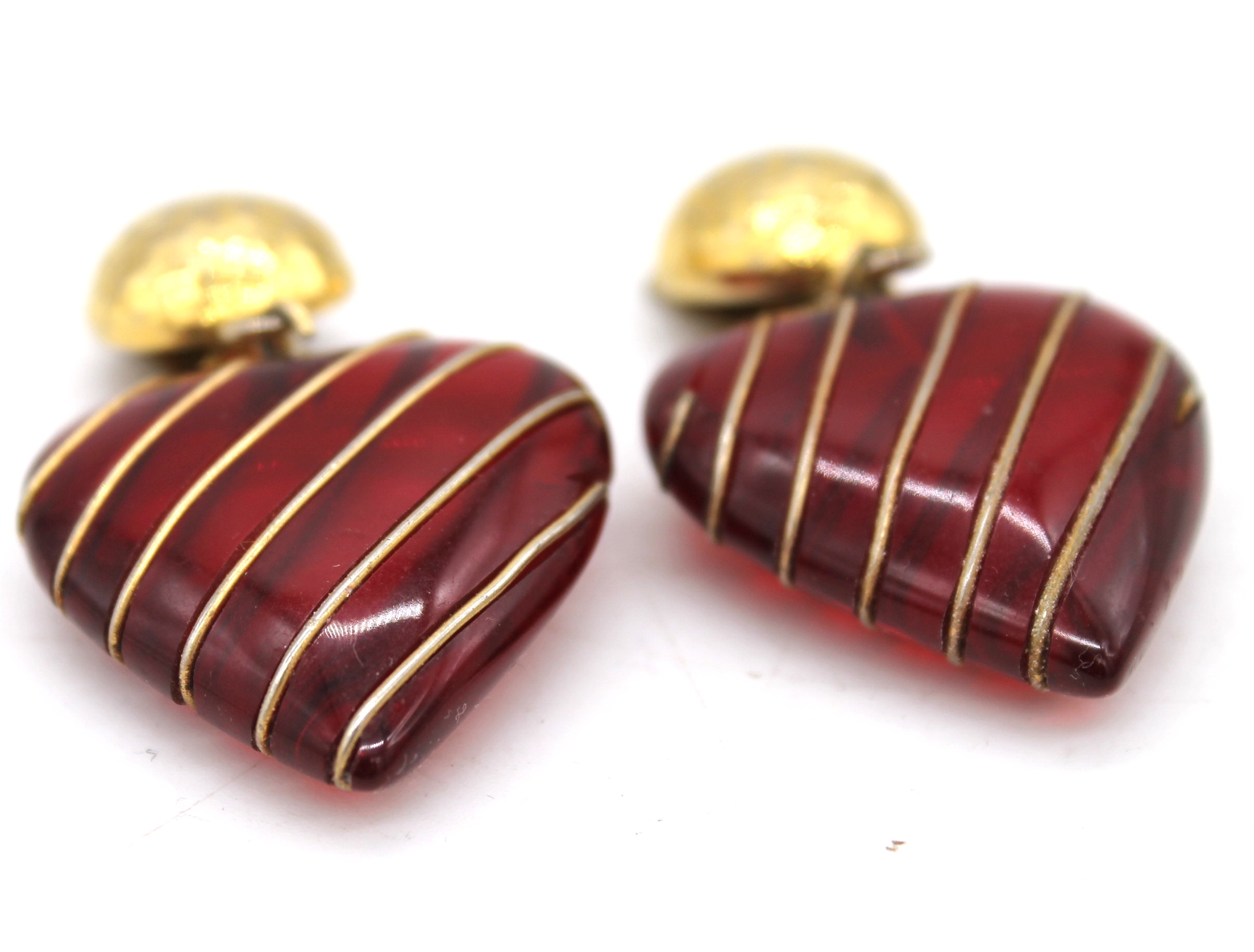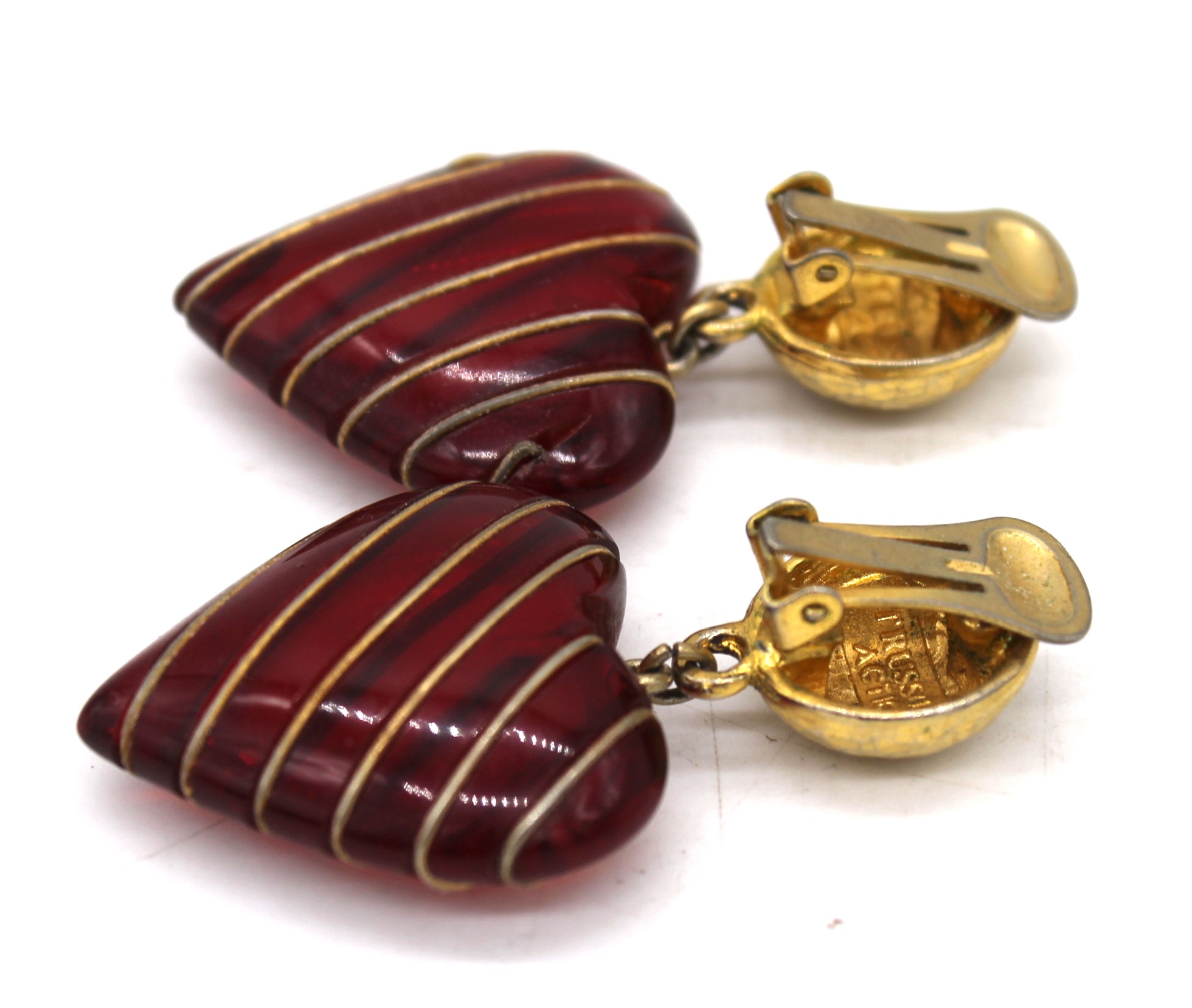 Orecchini Trussardi vintage a cuore color bordeaux con finiture dorate. Chiusura con clip.