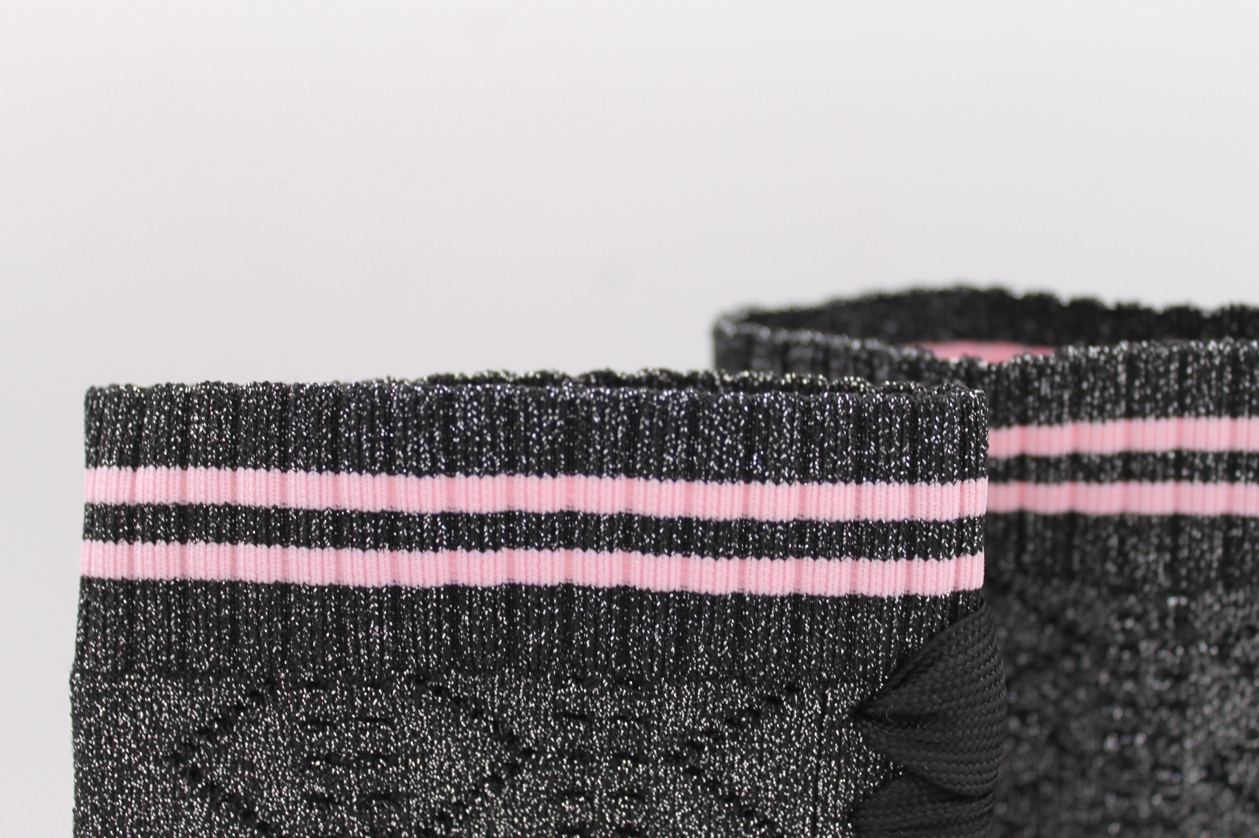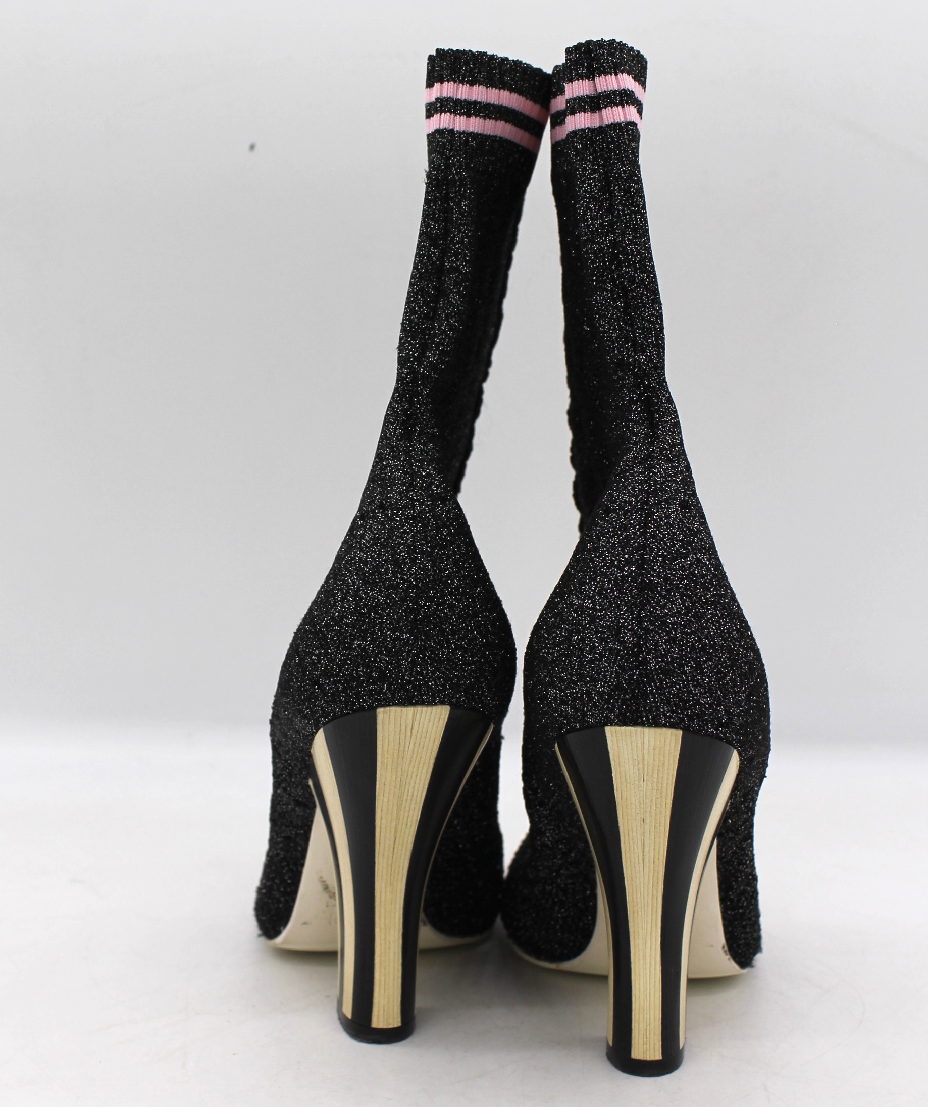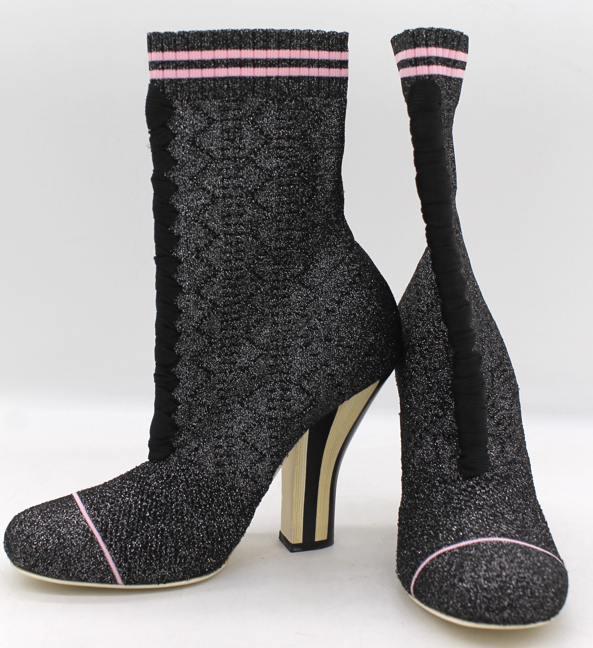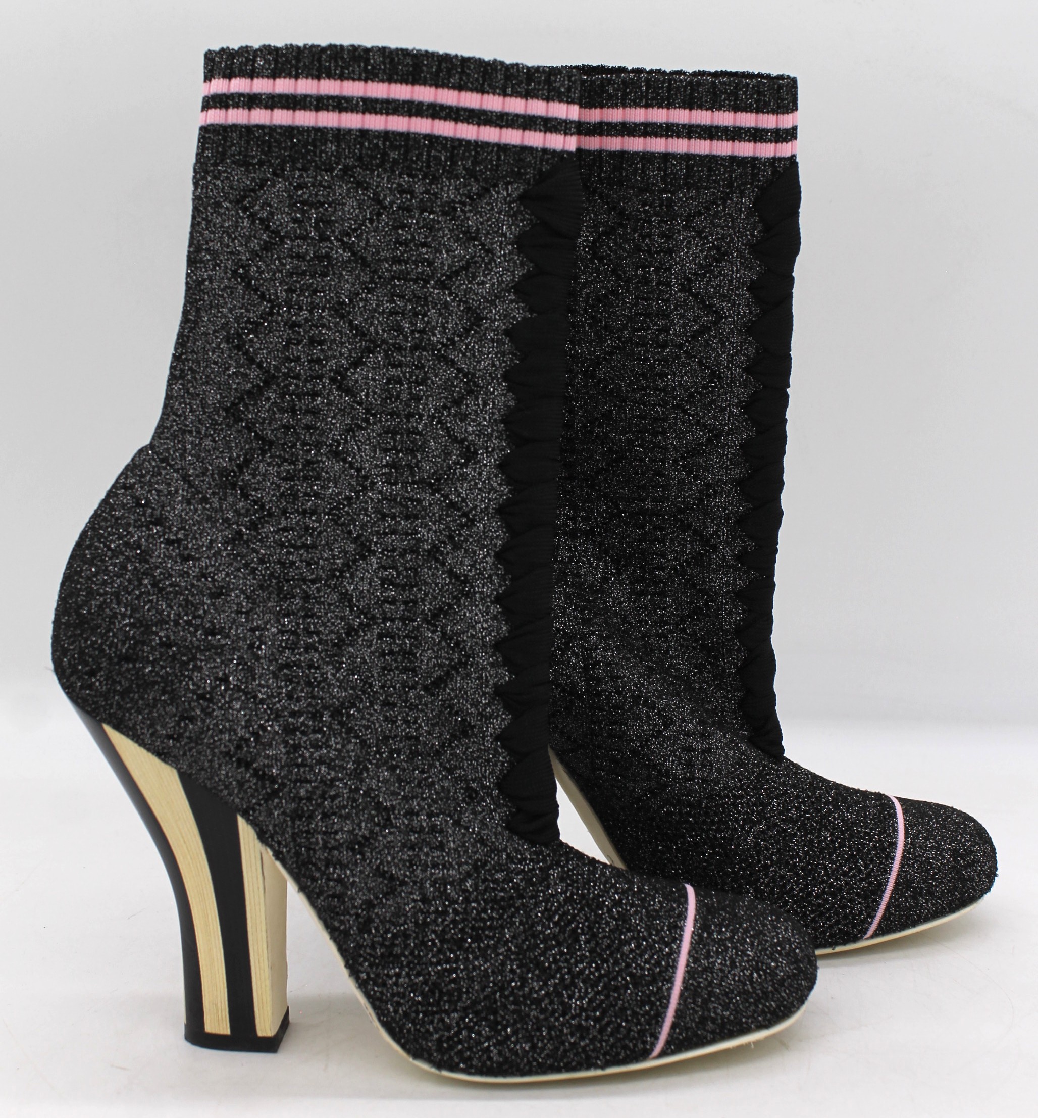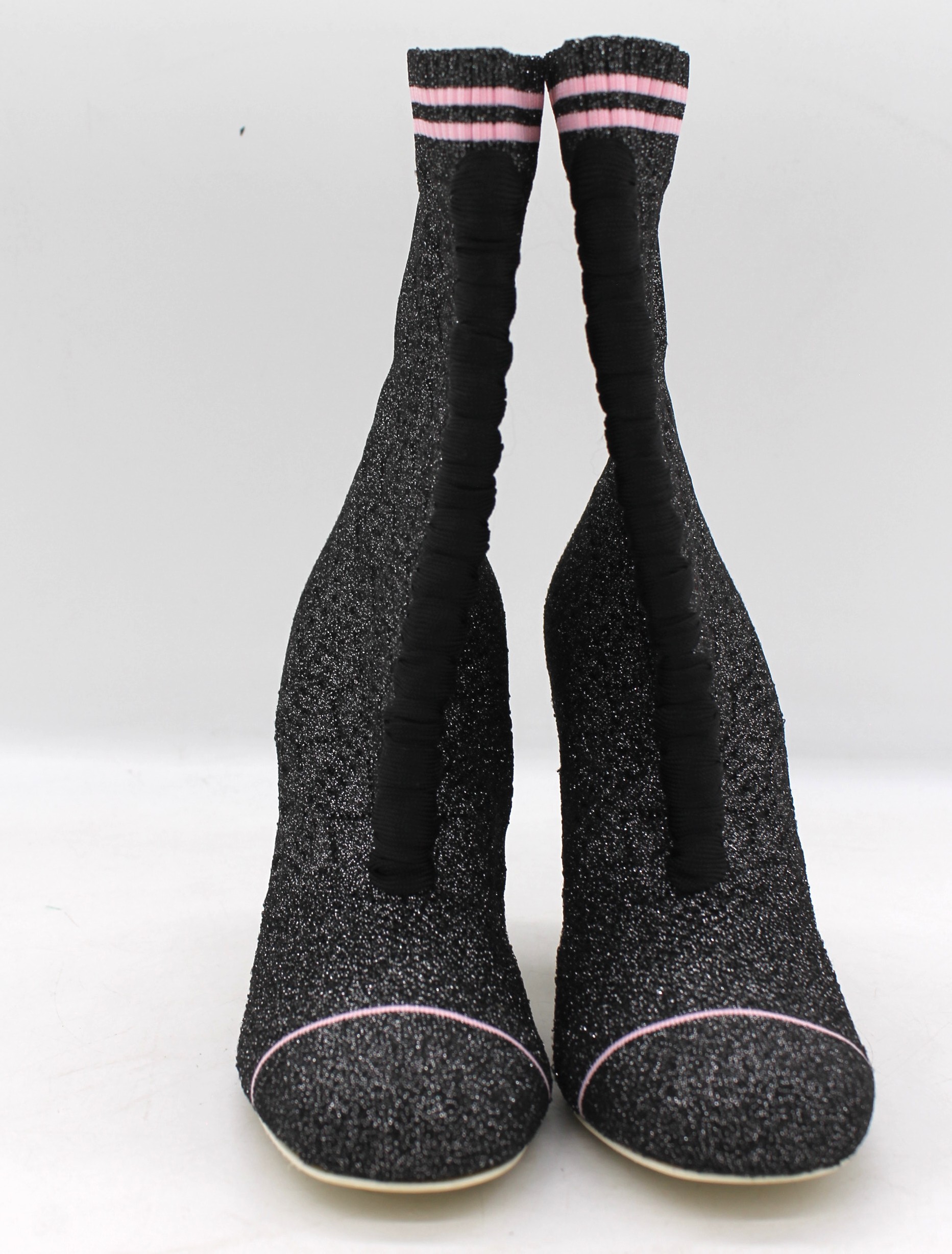 Stivale Fendi in tela grigia con glitter, finiture nero e rosa, con tacco.