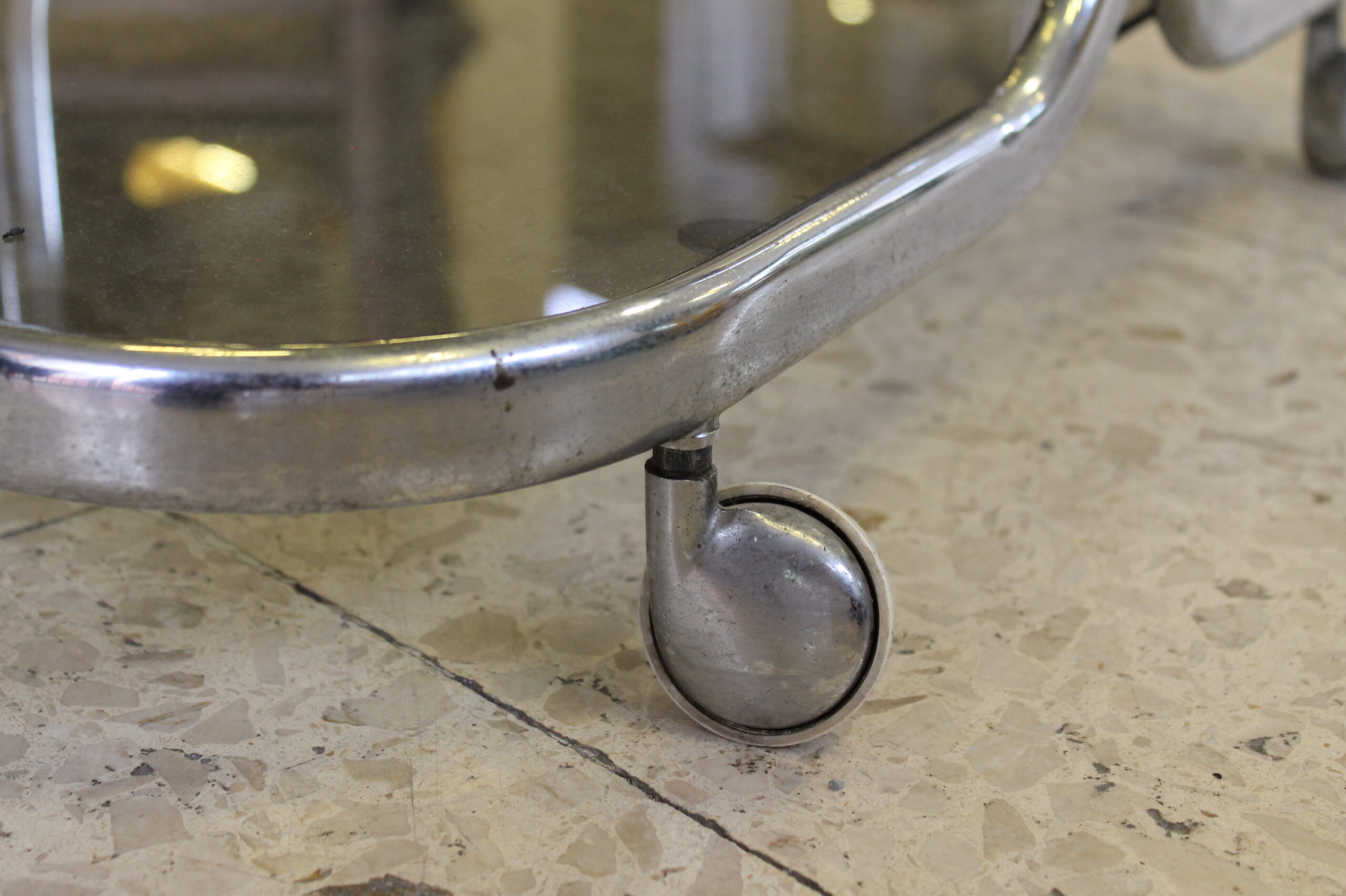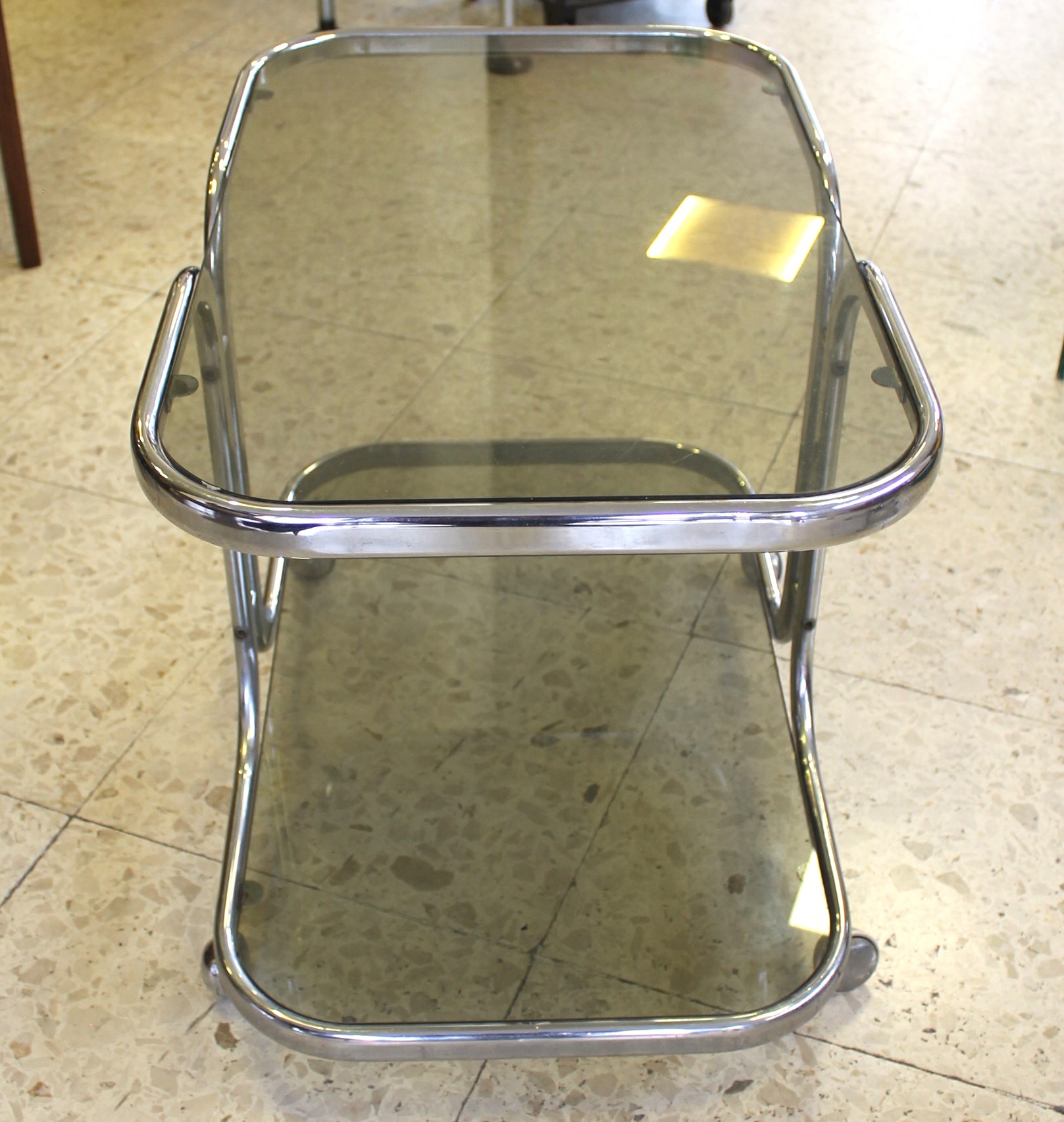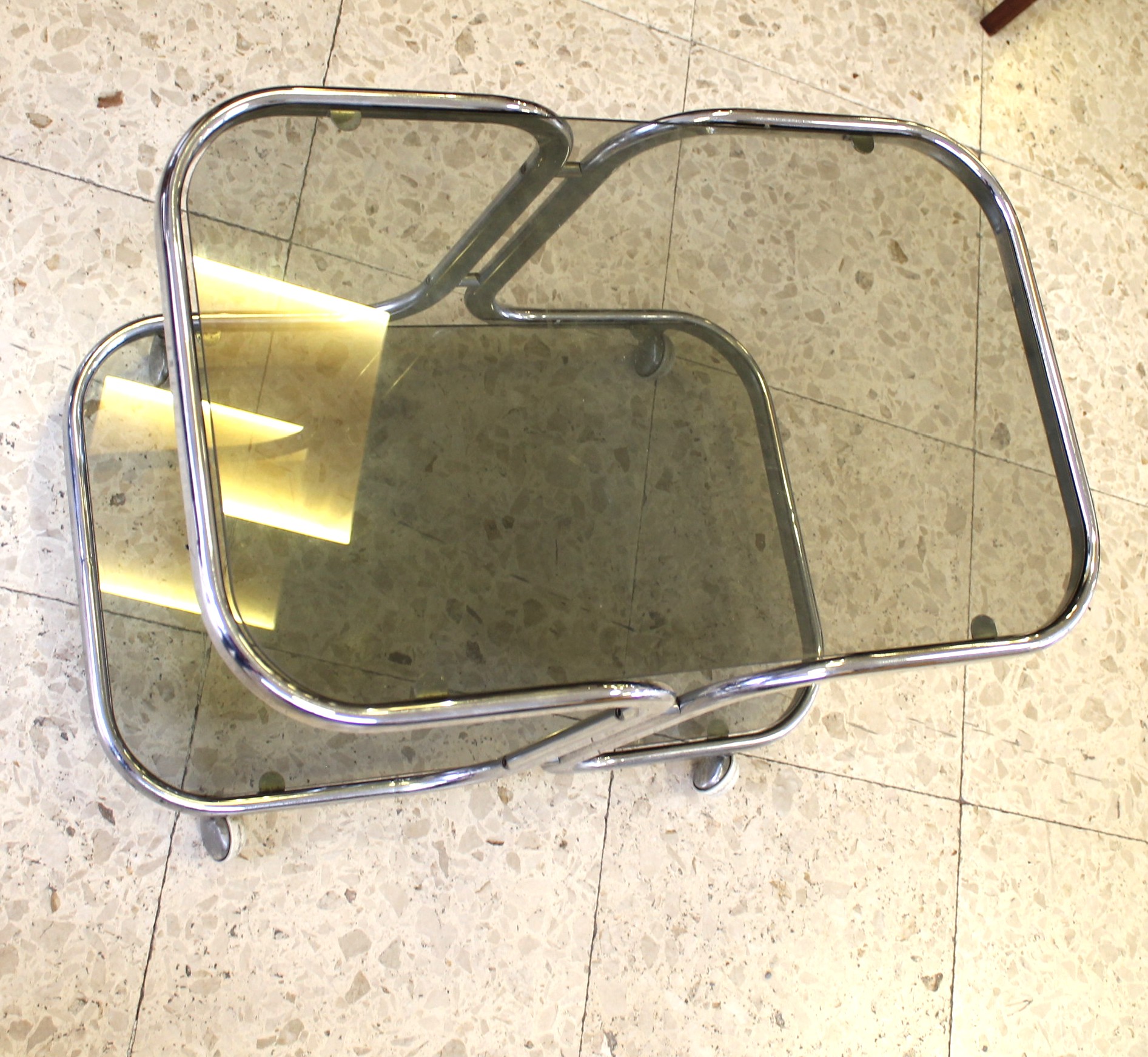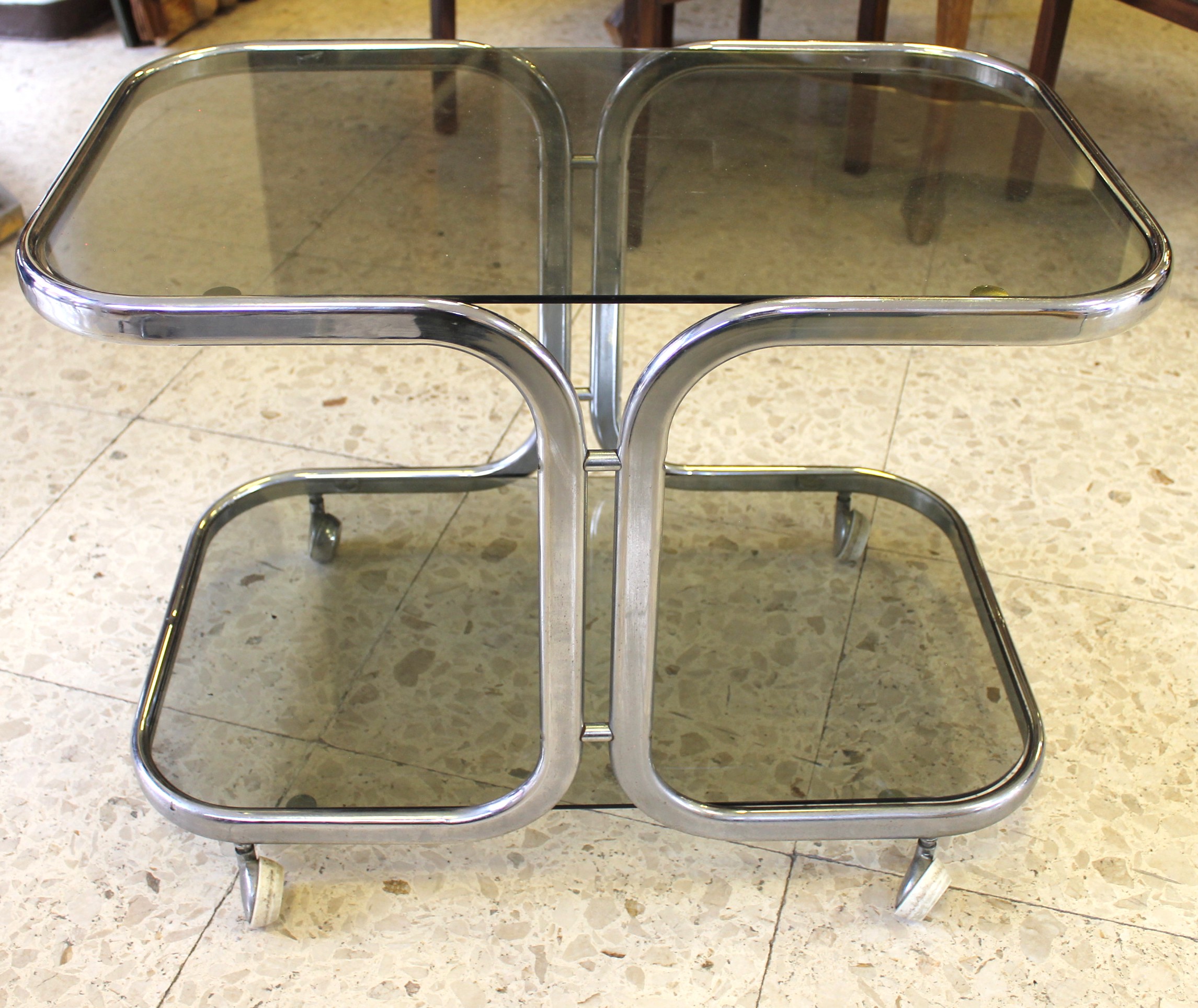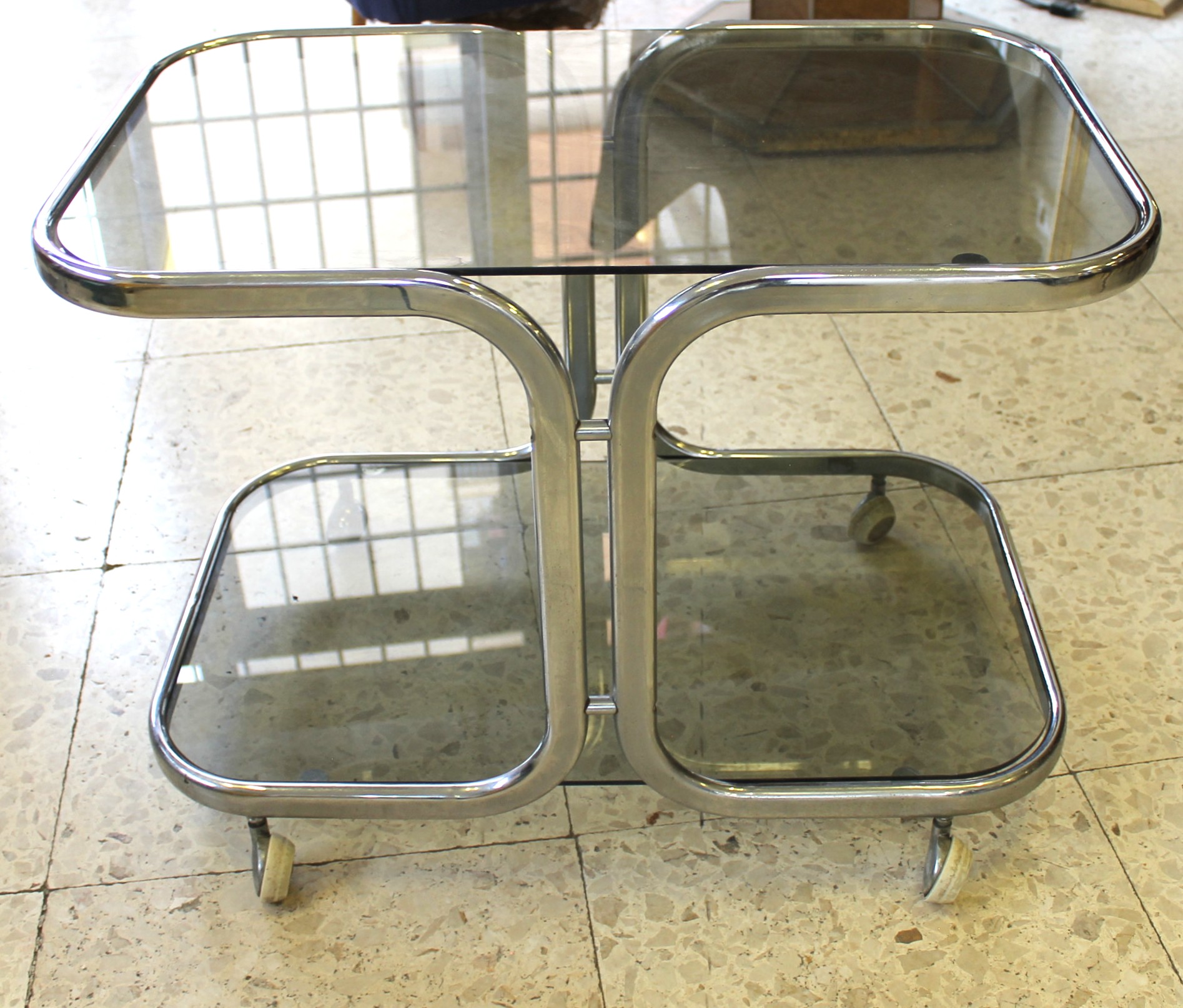 Tavolino design con rotelle, cromato e con doppio ripiano in vetro fumè.