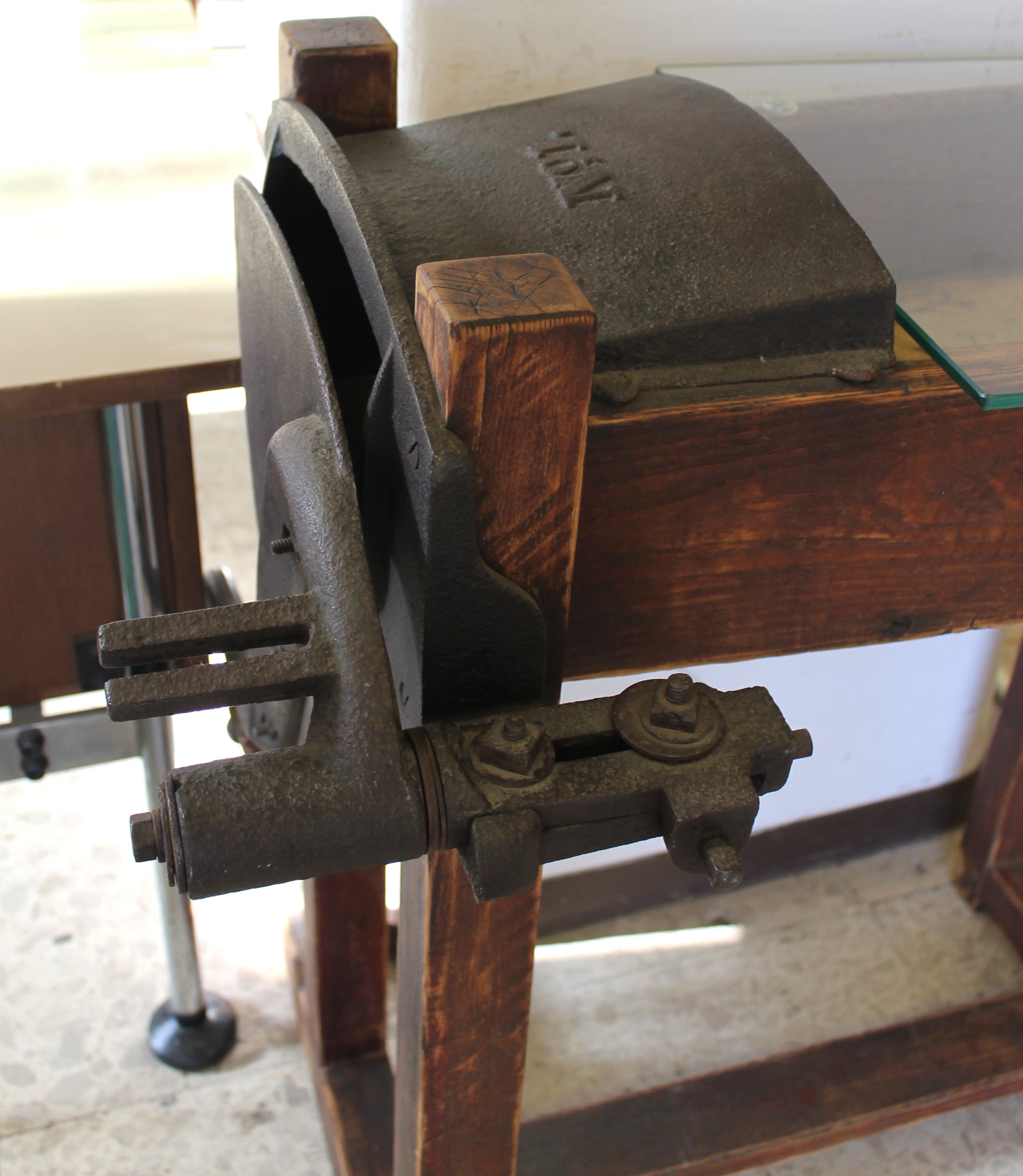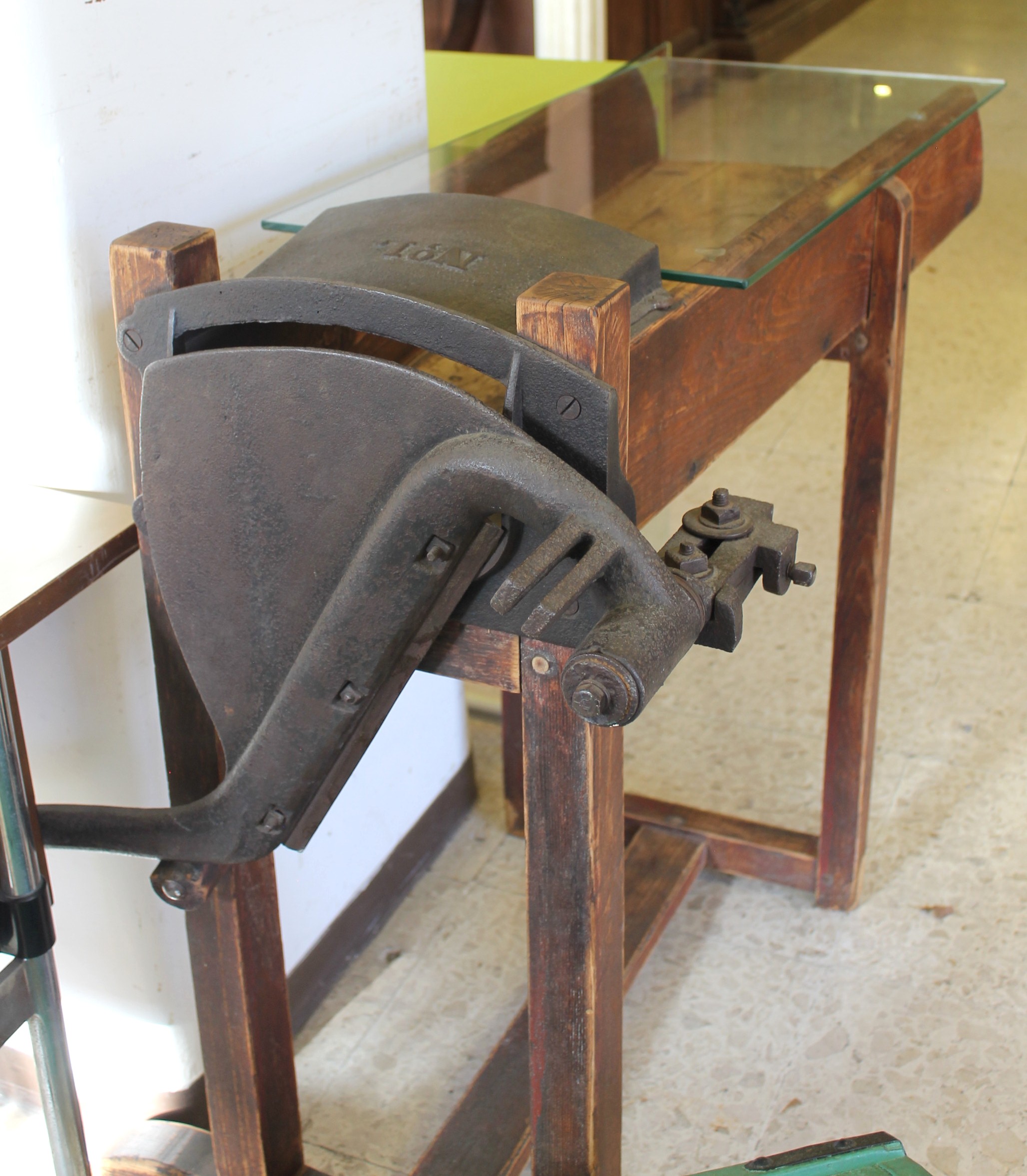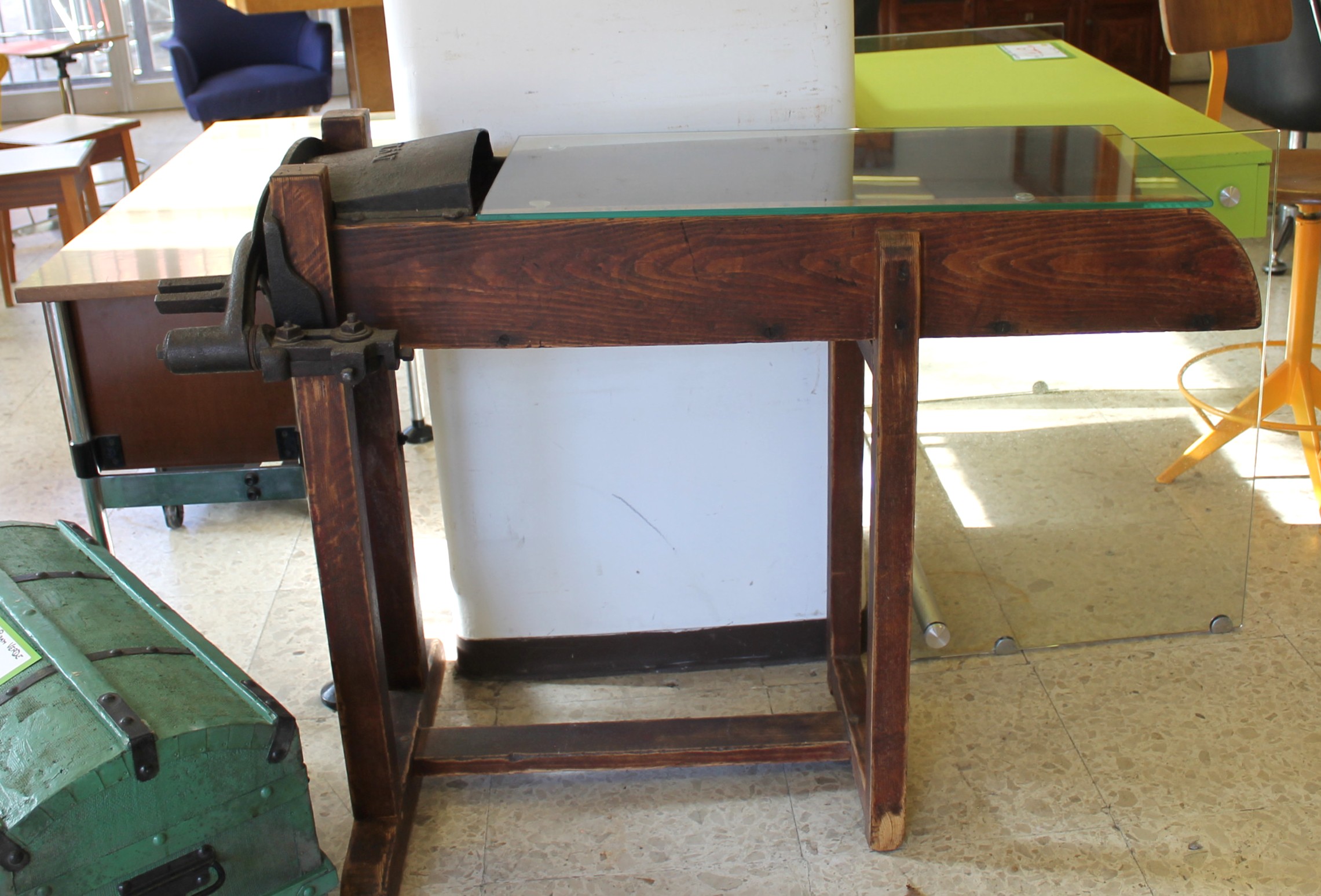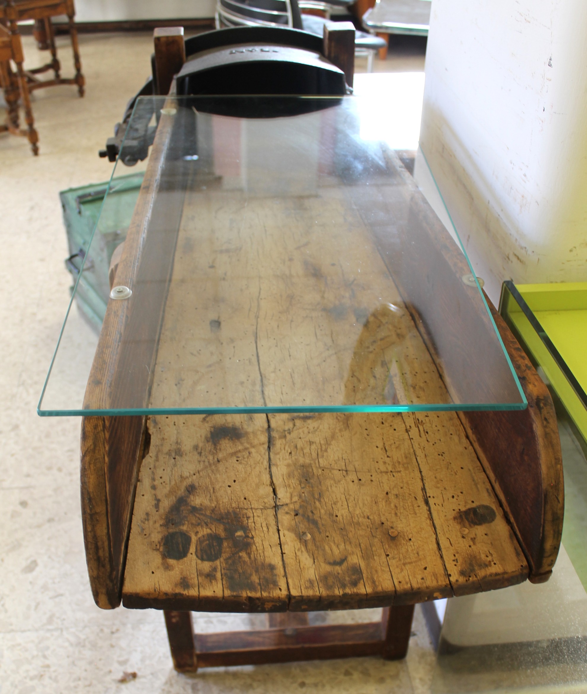 Tavolino d’epoca ricreato da un tagliafieno, ripiano in vetro. In ottimo stato.