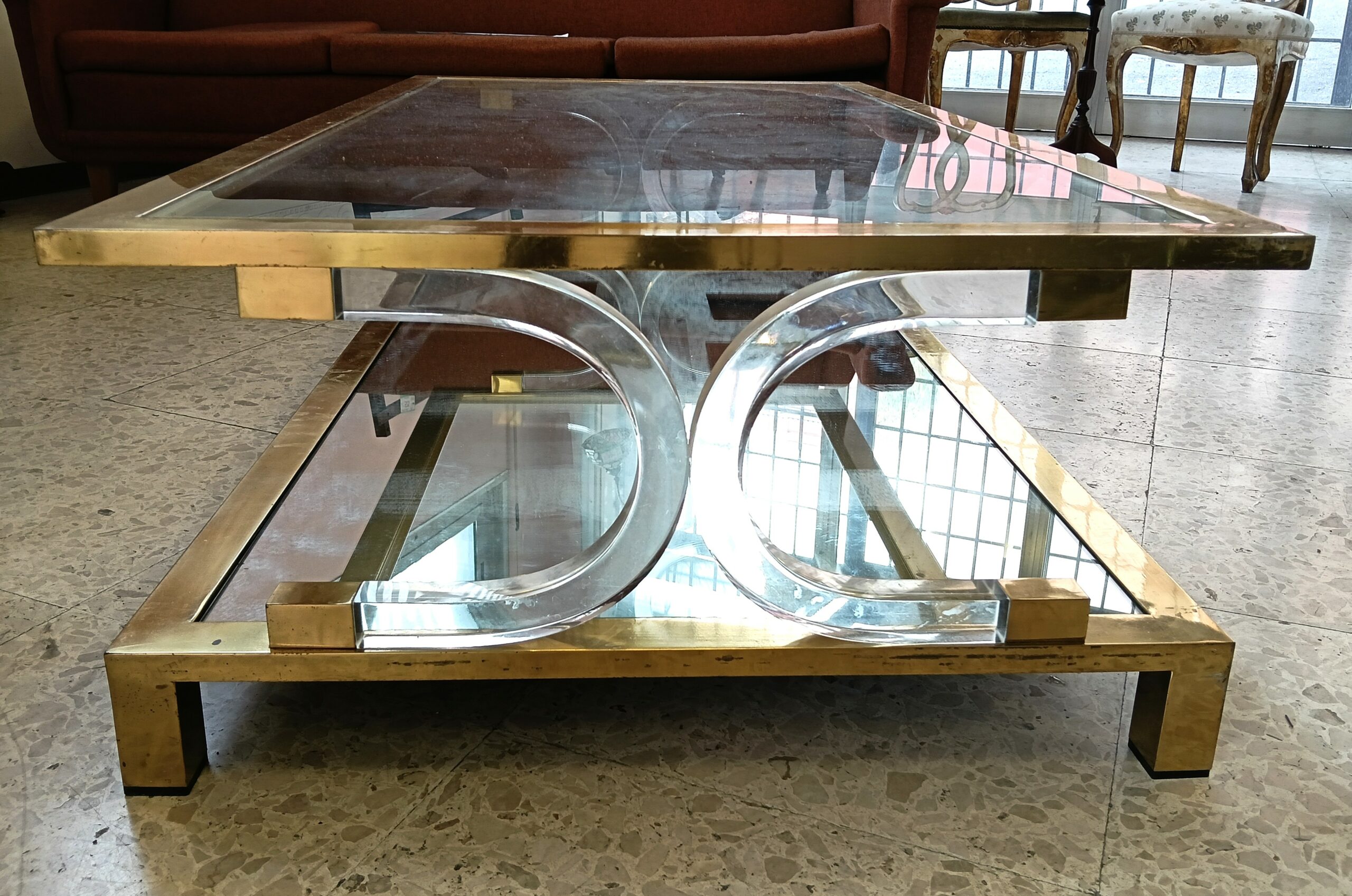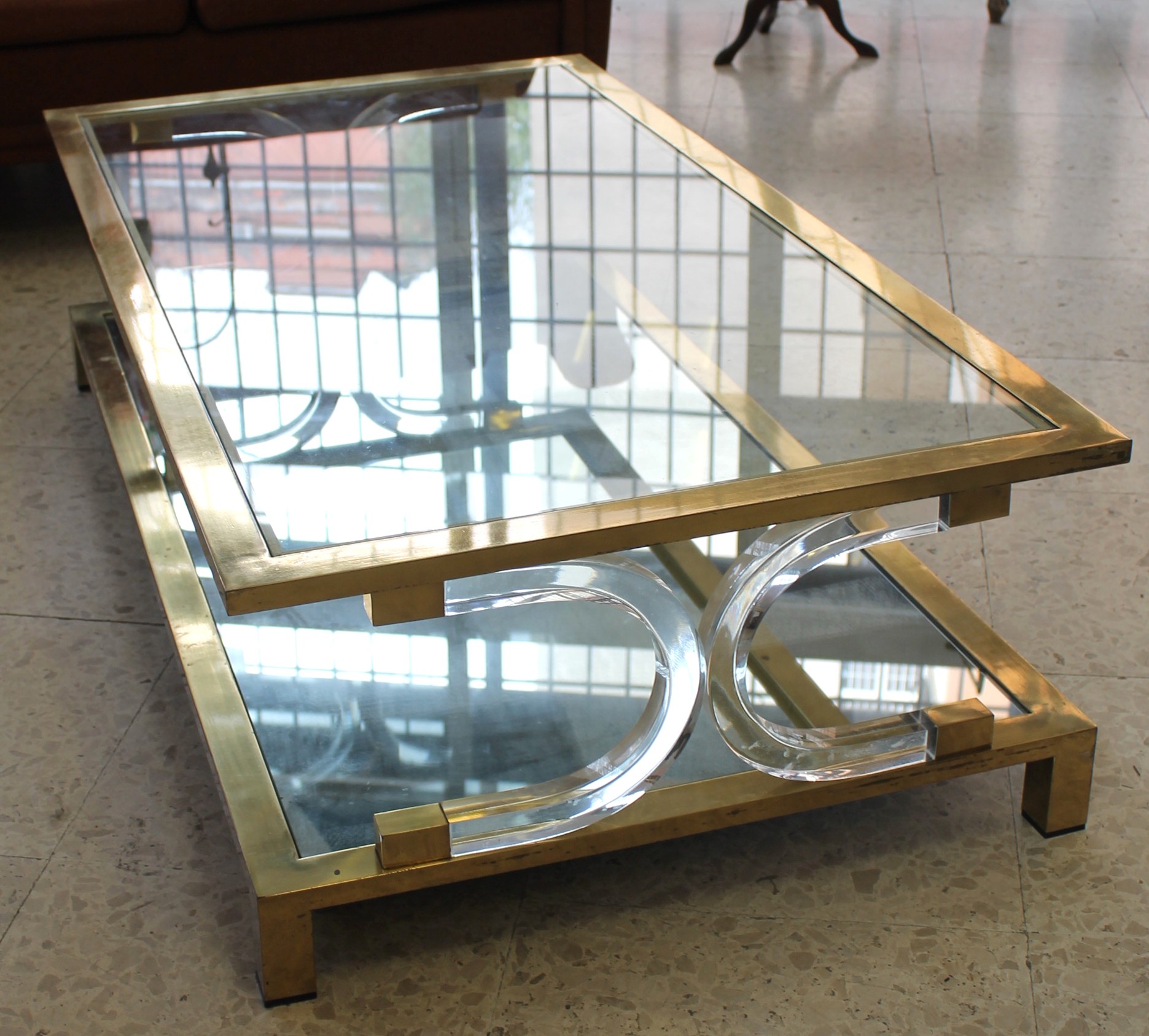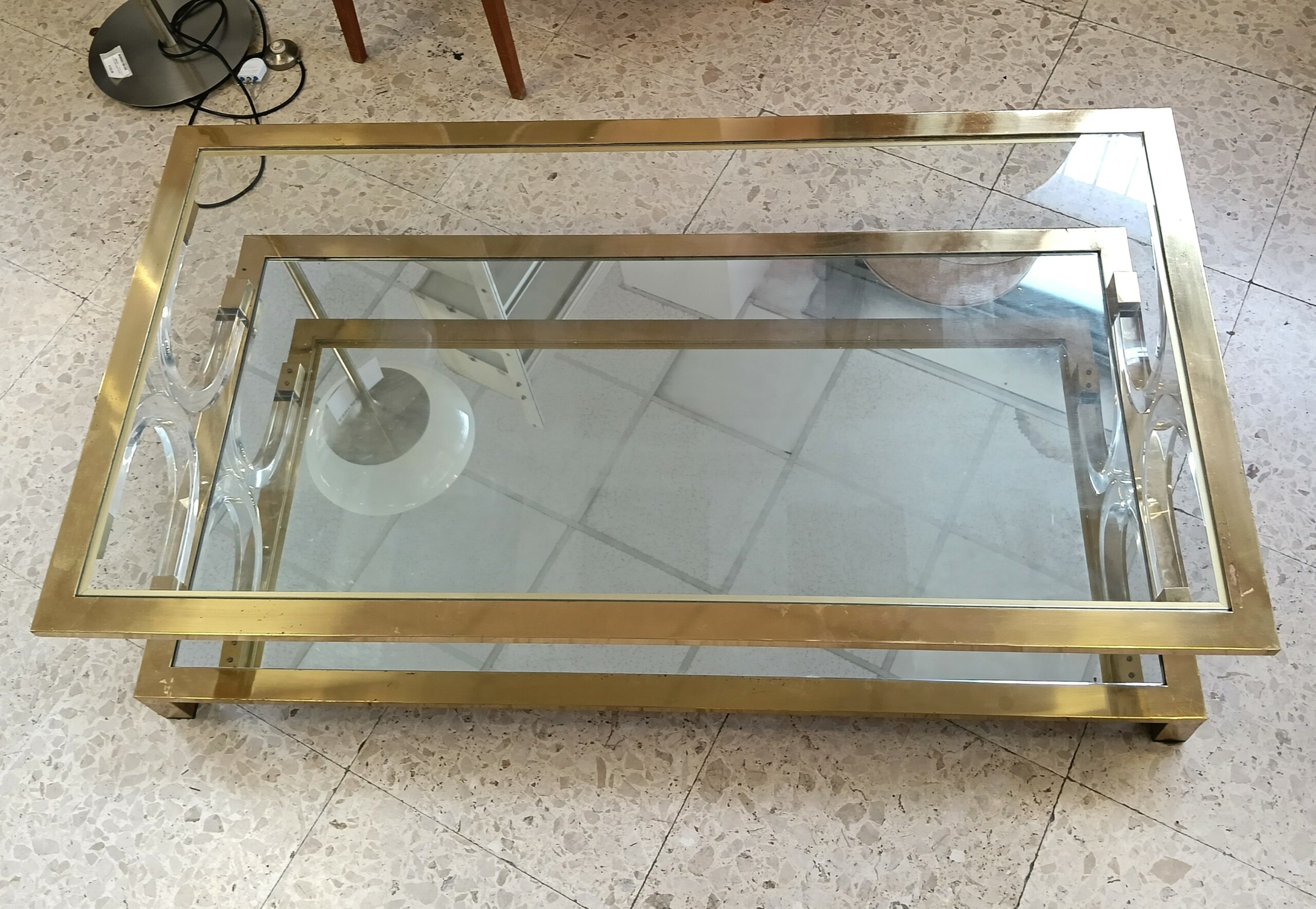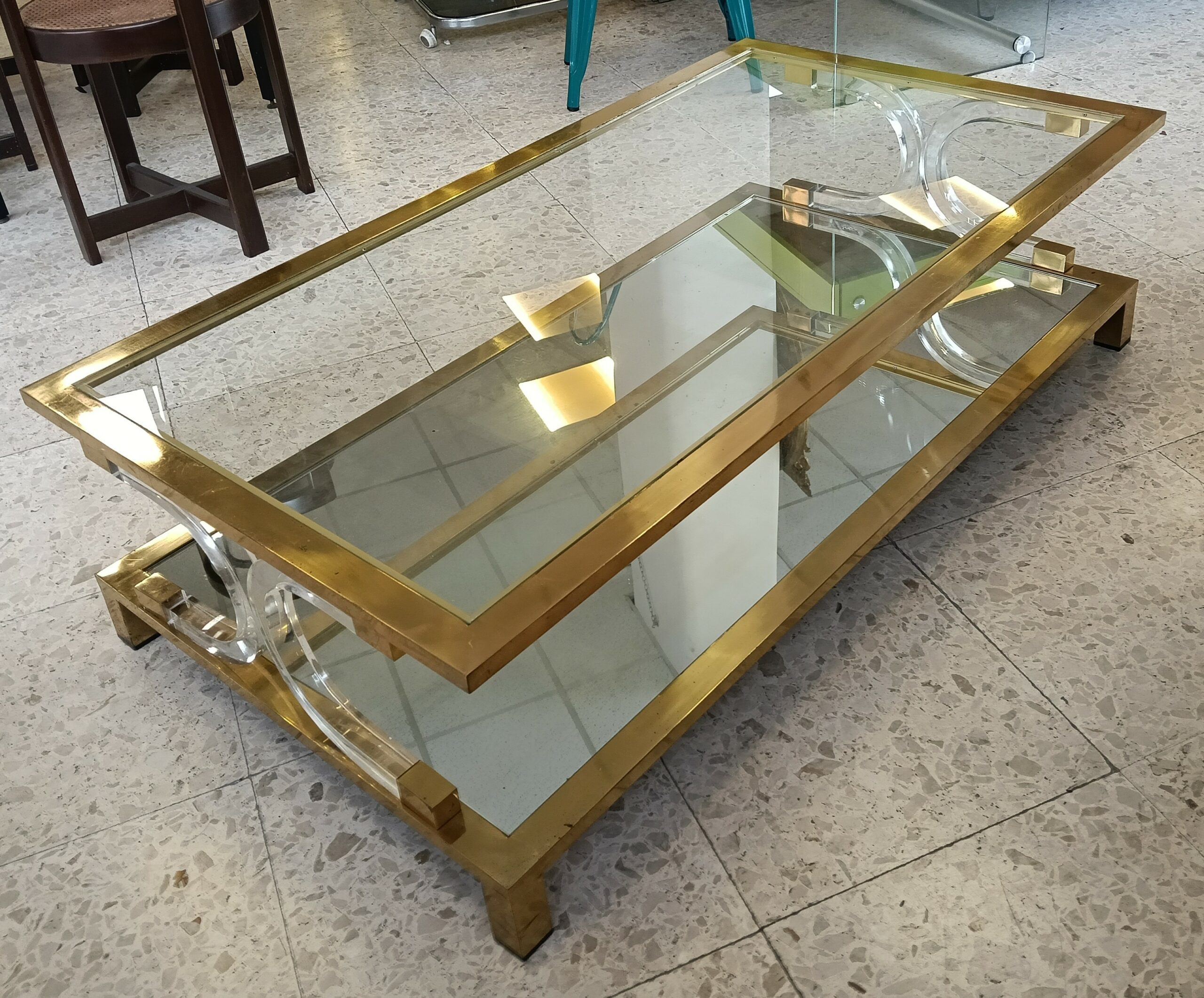 Tavolino basso in vetro, plexiglass e ottone. In buono stato.